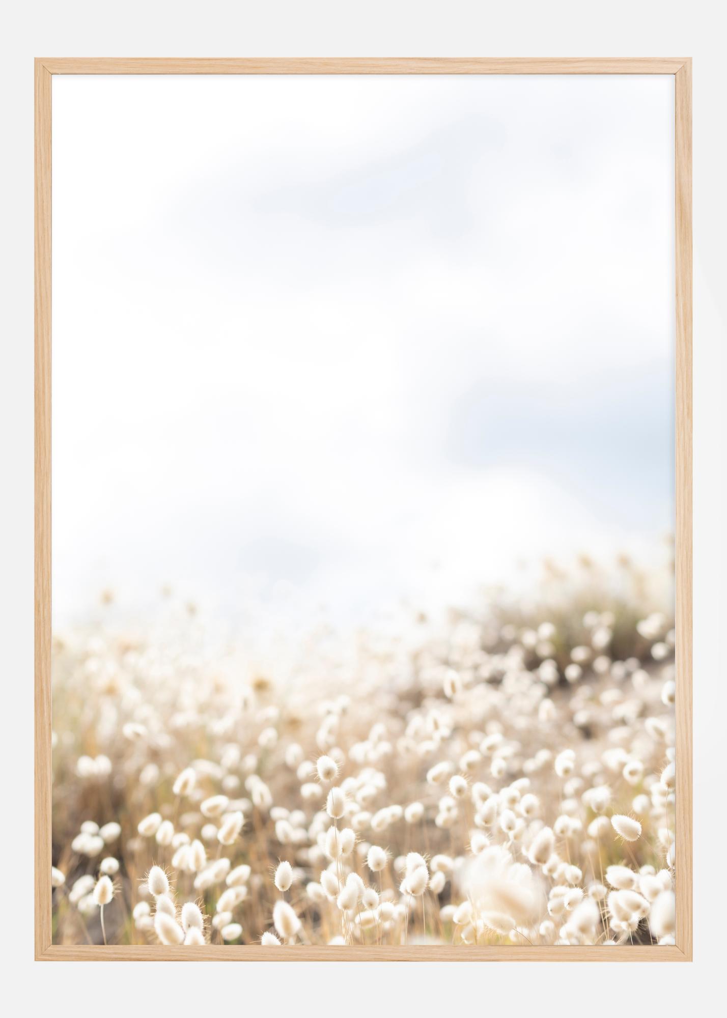 Afișul acesta de vis surprinde un câmp plin de flori ușoare și pufoase, scăldate într-o lumină solară blândă. Motivul, plin de natură și liniște, transmite un sentiment de căldură și calm. Capetele delicate ale florilor albe se leagănă în briza liniștită, iar imaginea este drapată în tonuri pastelate de galben, bej și alb, care se îmbină cu cerul albastru-clar.