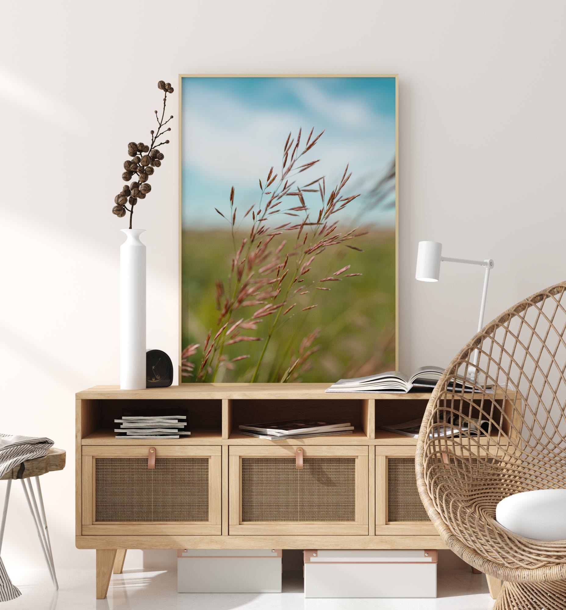 Un poster luminos cu un câmp verde cu o imagine de aproape a semințelor de iarbă pe o tulpină lungă. Semințele de iarbă de culoare roz-roșu moale sunt accentuate de câmpul verde deschis din spate. Un cer albastru cu nori albi moi face ca aceasta să fie o perioadă perfectă de vară. Această scenă veselă va lumina orice cameră.