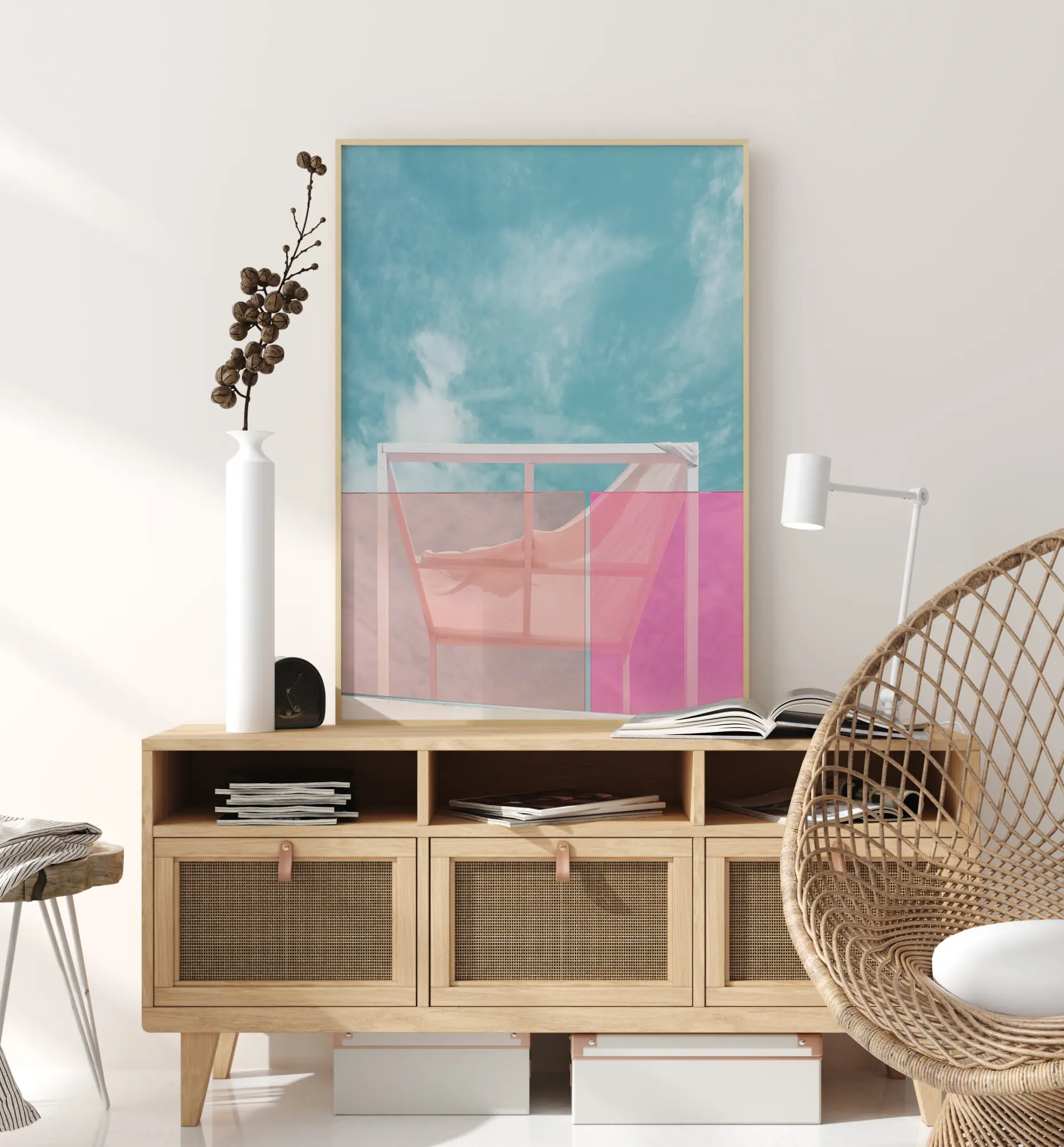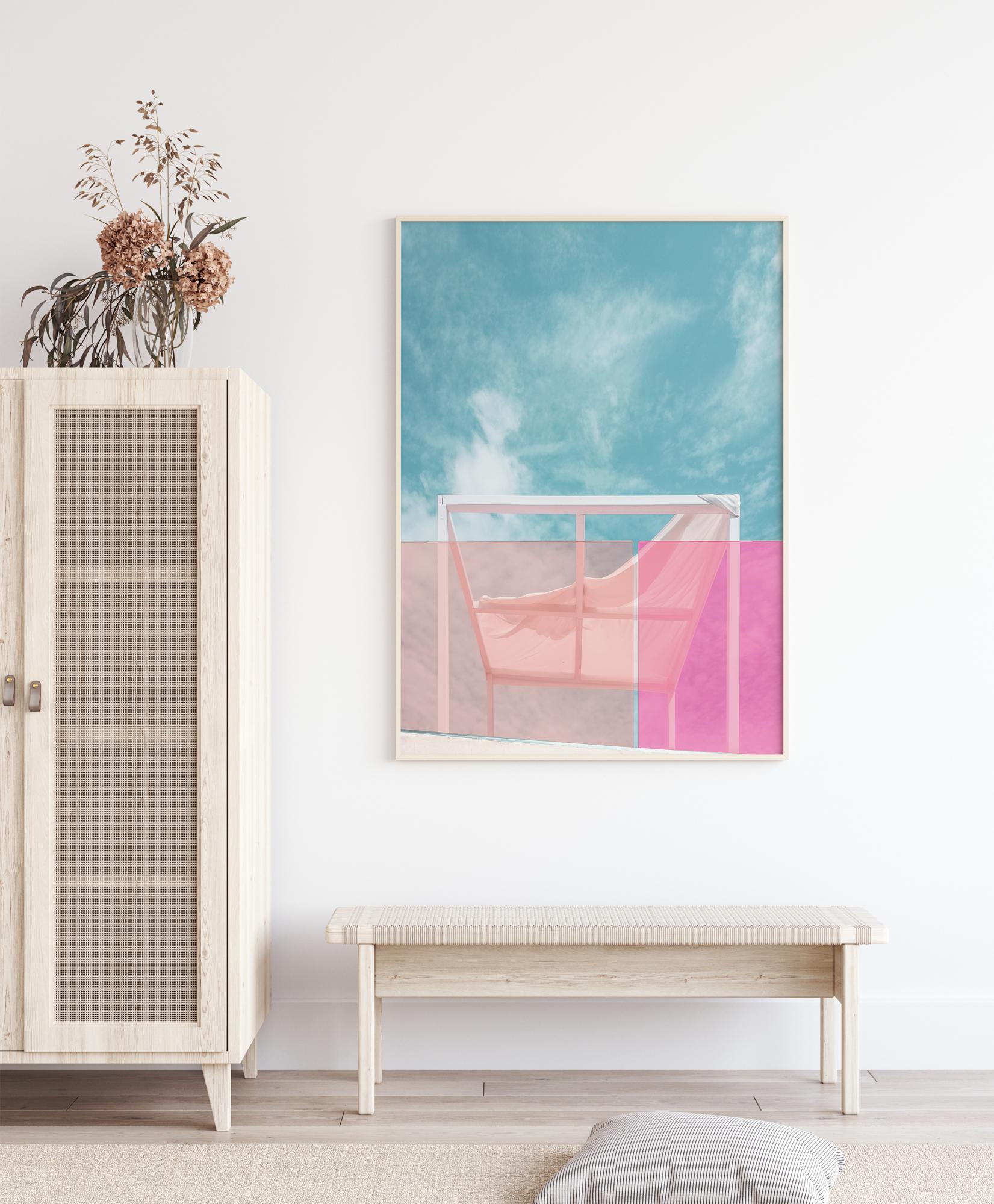Un poster colorat cu cer de vară și un acoperiș solar. Prin geamurile roz de la balcon se pot vedea acoperișul alb și norii albi și pufoși pe cerul albastru. Imaginează-ți să te bronzezi aici sus pe acoperiș într-o zi caldă de vară.