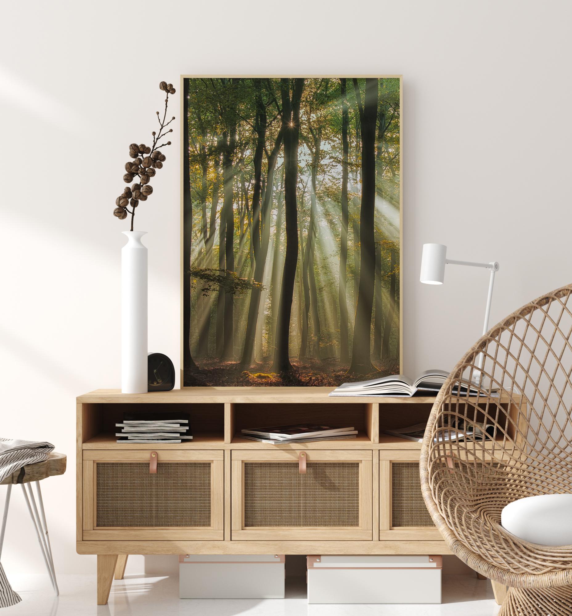 Un poster cu pădurea, cu razele soarelui care cad printre trunchiurile înalte ale copacilor. Trunchiurile lungi atrag privirea în sus prin imagine. Asemenea unei stele, soarele strălucește în vârf printr-o deschidere și aruncă raze moi prin copaci, luminând pădurea cu o nuanță verde moale. Imaginează-ți o plimbare prin pădurea liniștită.