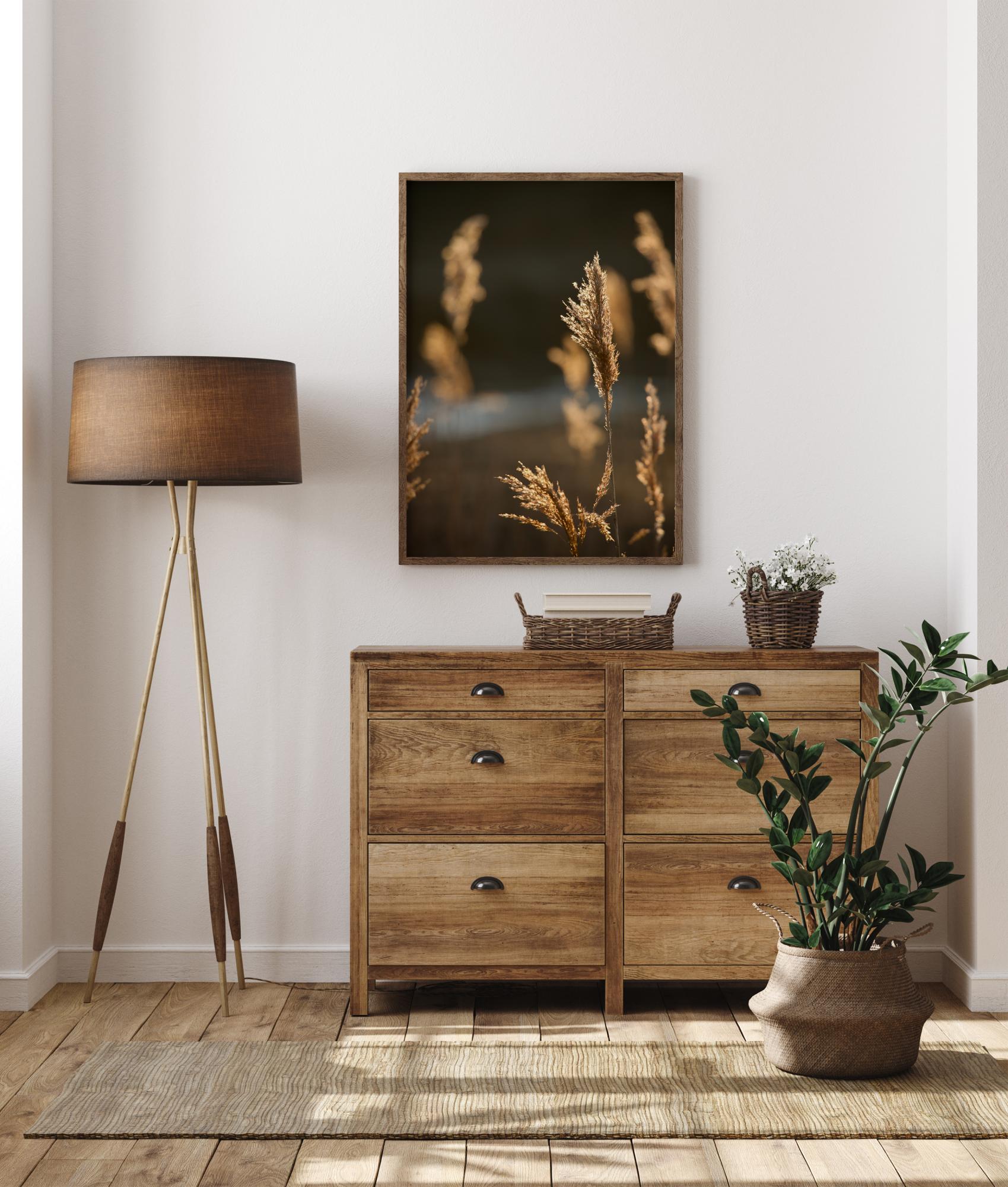 Un poster de vară cu soare pe un câmp. Prim-plan al firelor de iarbă care se leagănă într-o briză de vară. Acestea captează lumina aurie a soarelui, care strălucește și pe râul îndepărtat. Bucură-te de această imagine învăluitoare și delicată, care aduce vara în casa ta atunci când o agăți.