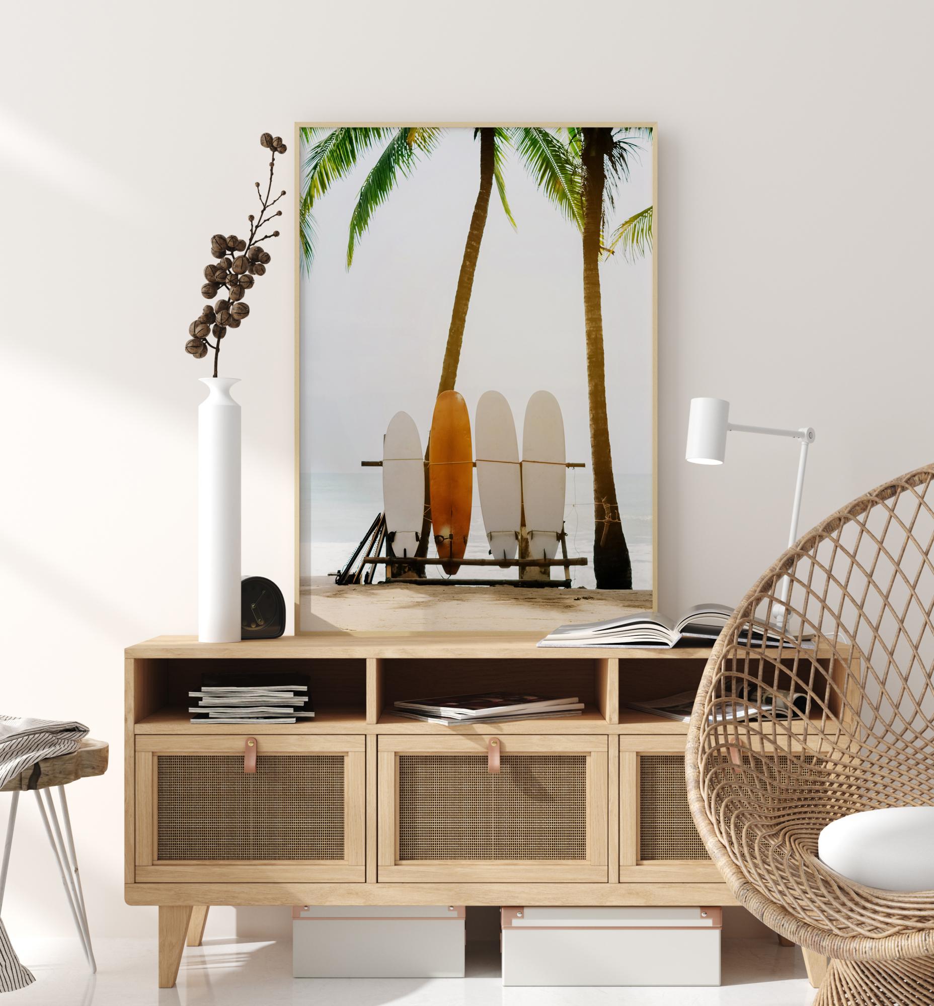 O poster estival cu o atmosferă pozitivă, cu plăci de surf, palmieri și nisip alb. Un motiv exotic minunat în culori plăcute și contraste elegante. Combinați cu alte motive minunate ale noastre pentru un perete de tablouri mai mare și mai viu.