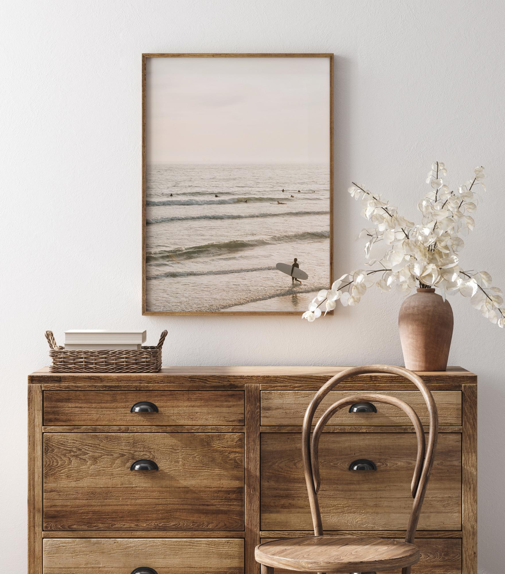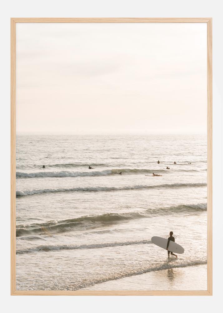 Un poster cu un ocean vast plin de surferi care așteaptă următorul val mare. Capete mici se leagănă departe în ocean și un ultim surfer merge printre valuri cu placa sa. Marea este liniștită în lumina moale a dimineții și există o senzație de așteptare în aer.