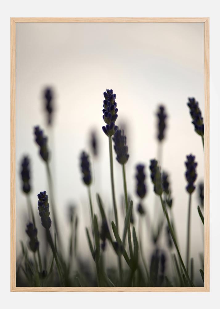 Un poster cu flori cu un prim-plan al florilor de lavandă pe un câmp. Dacă privești cu atenție, poți vedea bobocii mov care se leagănă în vârful tijelor verzi. Acestea stau drepte pe un fundal alb simplu, complementul perfect pentru o cameră plină de culoare.
