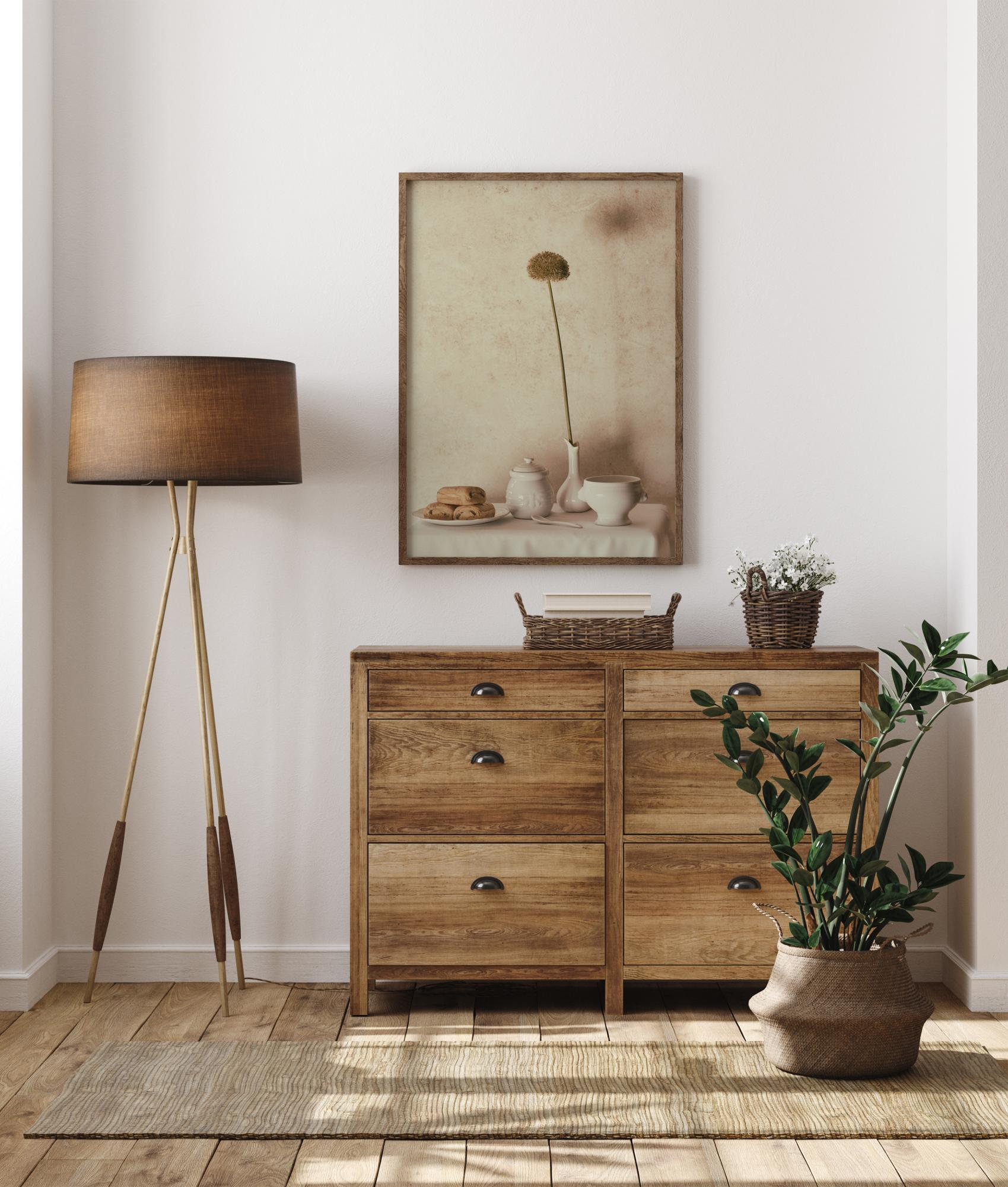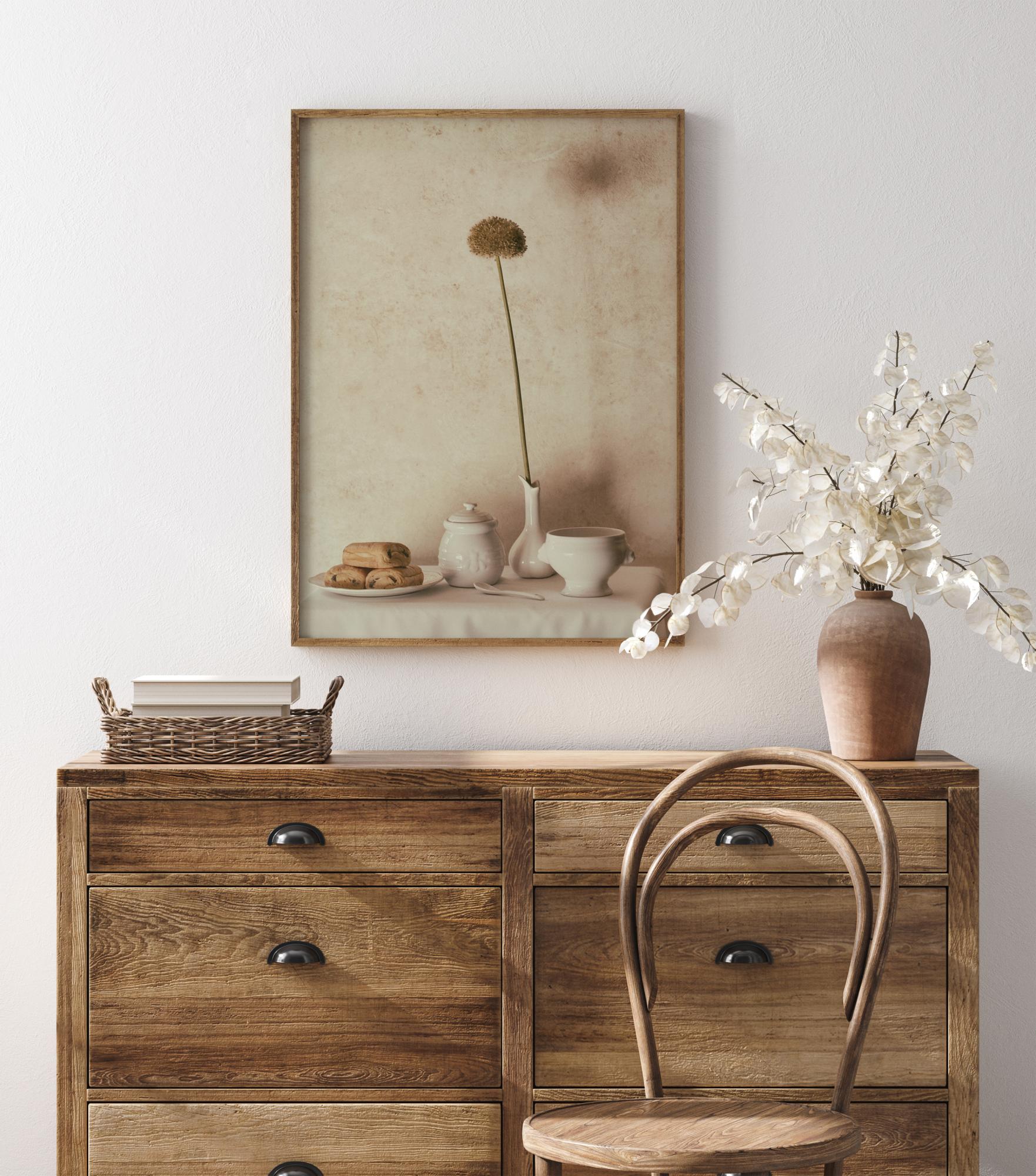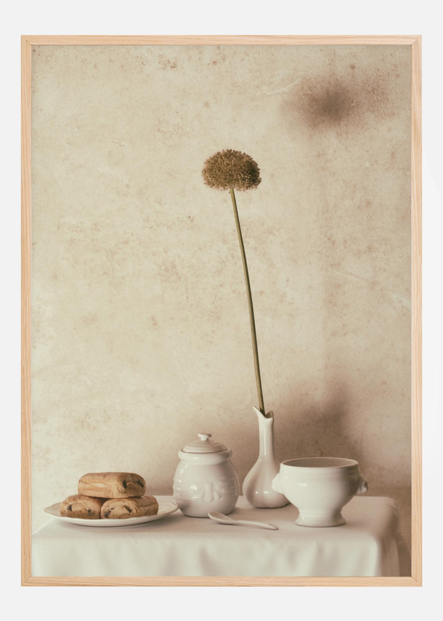 Un poster cu natură moartă cu un pain au chocolat într-un bol, un borcan de miere și o vază cu o singură floare. Acest mic dejun dulce este plasat pe un fundal alb neutru pentru o atmosferă simplă, dar eficientă. Imaginează-ți că ești pe continent când îți iei micul dejun dimineața cu acest lucru în bucătăria ta.