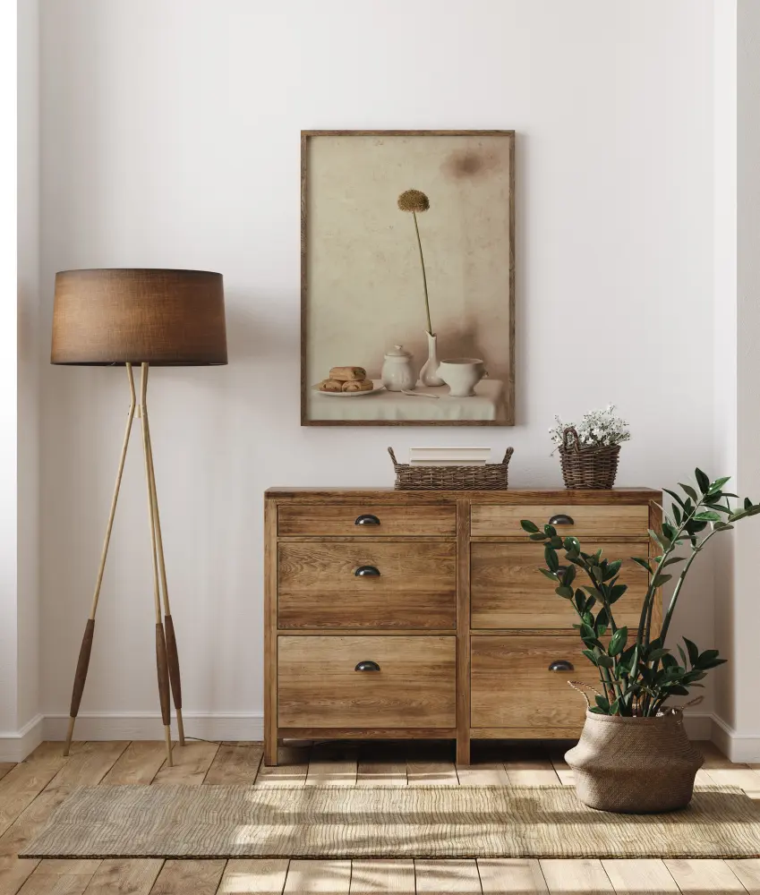 Un poster stilleben cu pain au chocolate într-un castron, un borcan de miere și o vază cu o singură floare. Acest mic dejun dulce este plasat pe un fundal de perete alb neutru pentru o atmosferă simplă, dar eficientă. Imaginează-ți că ești pe continent atunci când îți iei micul dejun de dimineață cu aceasta în bucătăria ta.