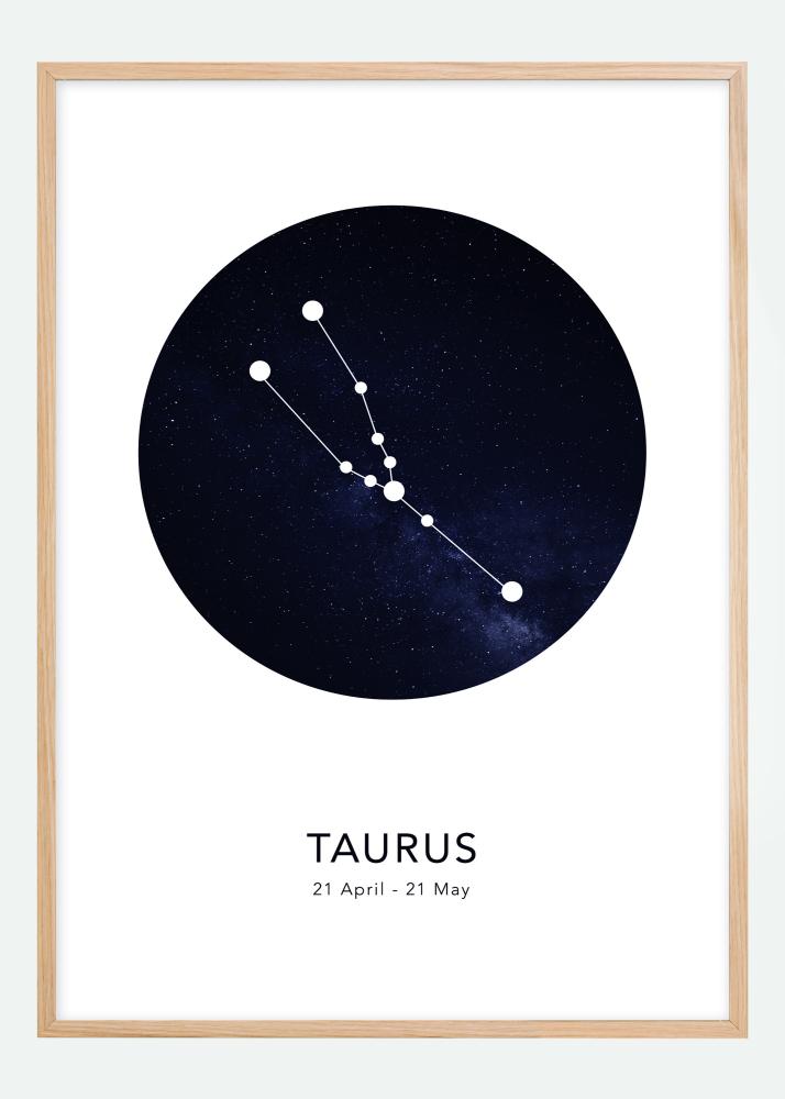Oferă un tablou personalizat cuiva pe care îl placi! Acest poster elegant are un motiv al zodiei Taurului pe un fundal sub forma unui cer înstelat negru și albastru. Mai jos se află numele împreună cu datele corespunzătoare în engleză.