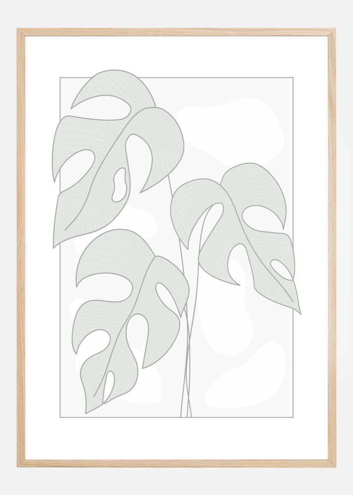 Un poster simplu cu frunze ilustrative de monstera. Trei frunze mari umplu imaginea, fiecare într-o nuanță de gri moale. Linii mai subțiri constituie tulpinile atunci când aceste frunze elegante cu găuri atârnă în această imagine. Păstrează-l discret agățând acest poster pe un perete verde moale pentru o senzație de natură.
