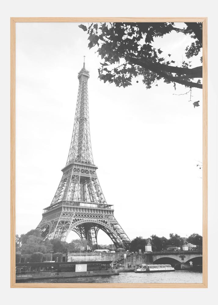 Un poster urban cu Turnul Eiffel din Paris. Turnul gri se vede clar pe un cer alb. Mai jos se vede agitația râului cu o barcă și un pod. O ramură de copac aproape ascunde vârful turnului în această imagine simplă și naturală a acestui monument iconic.