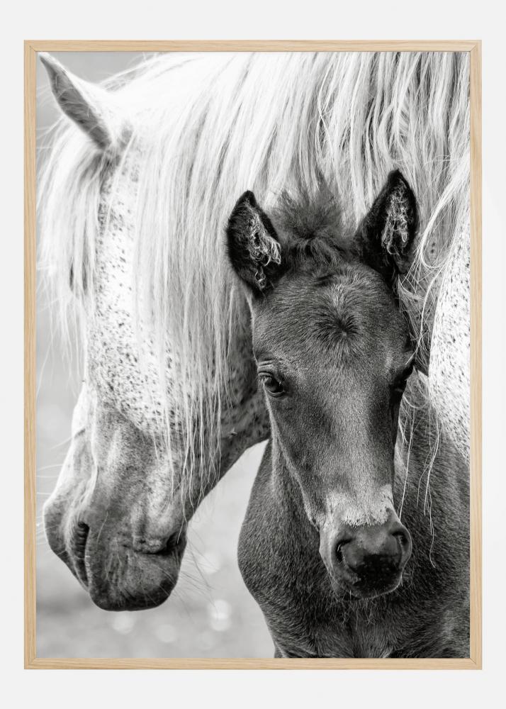 Un poster cu animale cu o iapă și mânzul ei. Iapa își protejează mânzul și își înclină capul alb peste spatele lui. Mânzul de culoare închisă privește către cameră din acest adăpost, cu urechile ciulite de curiozitate. Bucurați-vă de această imagine dulce de bebeluș.