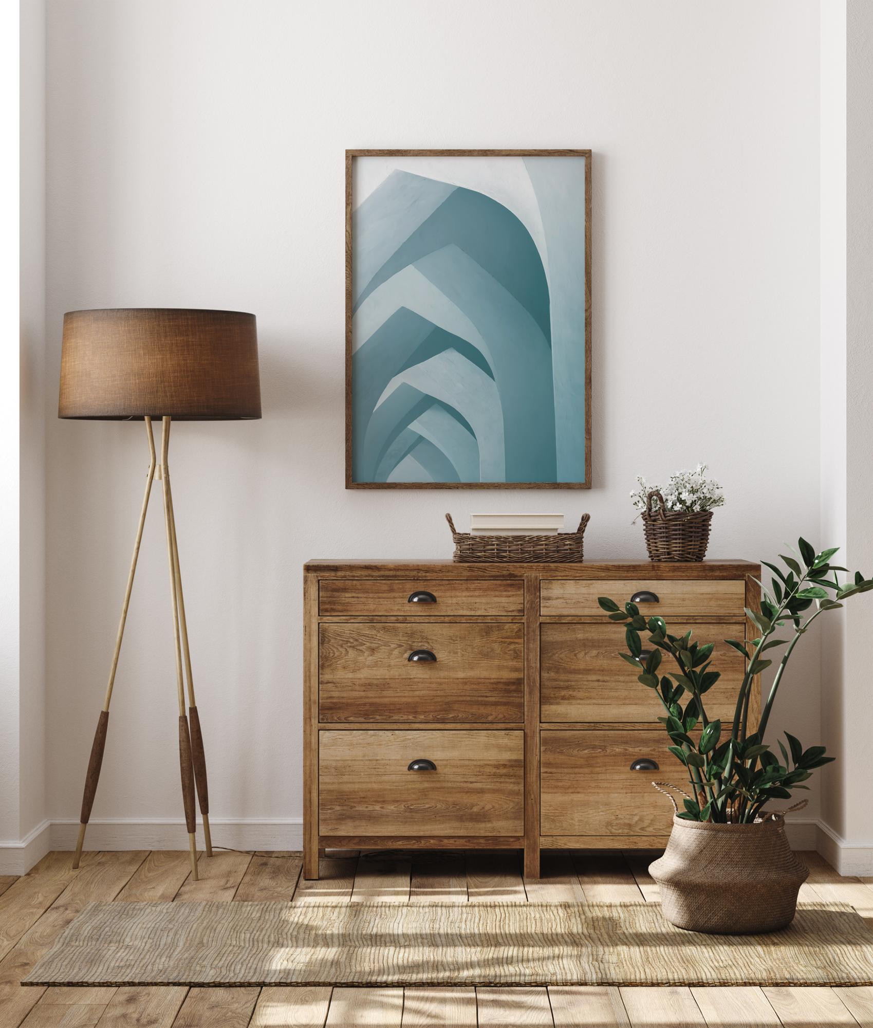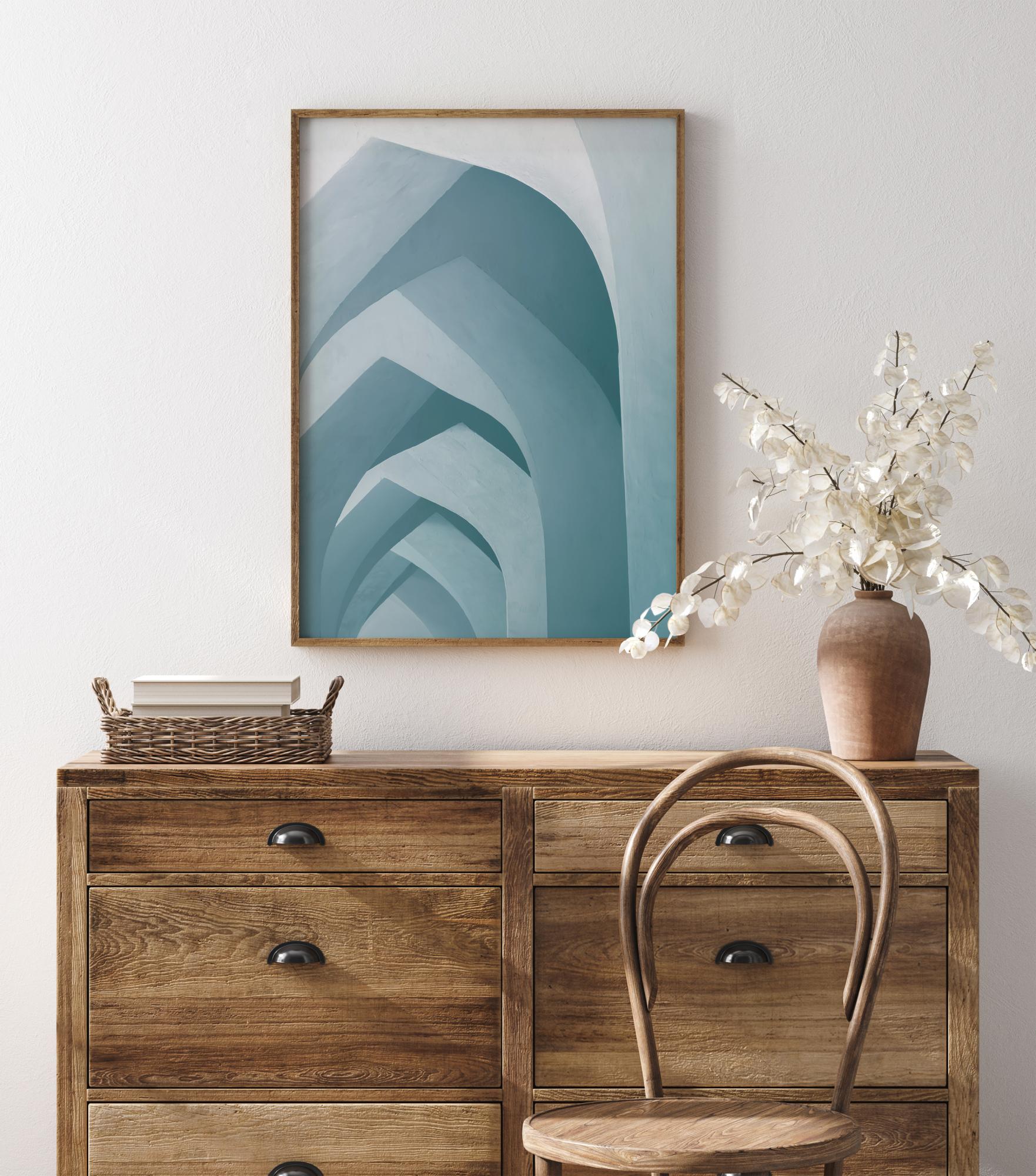 Un poster grafic cu diferite forme care creează arcuri. Fiecare formă de arc este creată cu ajutorul culorilor bloc în diferite nuanțe de albastru. Întunericul și lumina sunt opuse pentru a crea o iluzie de adâncime și senzația unui coridor lung. Agață-l pe un perete alb pentru a face culorile și mai contrastante.