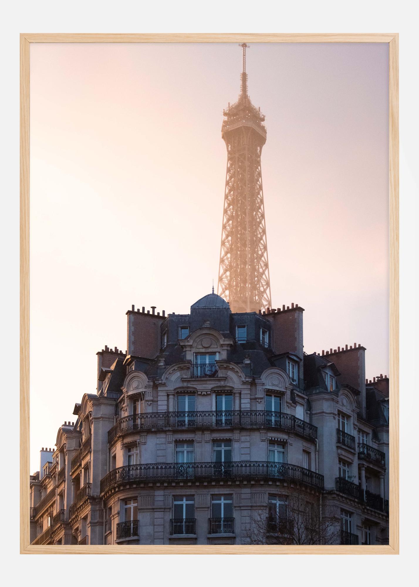 Motivul este plin de nuanțe de roz și portocaliu care armonizează cu bejul cald al clădirilor și silueta distinctivă a Turnului Eiffel, oferind un sentiment de frumusețe atemporală. Această poster nu este doar un omagiu adus reperelor iconice ale Parisului, ci și o invitație de a visa la unul dintre cele mai iubite orașe din lume, ceea ce o face o afișă ideală pentru cei care apreciază stilul și eleganța mondială.