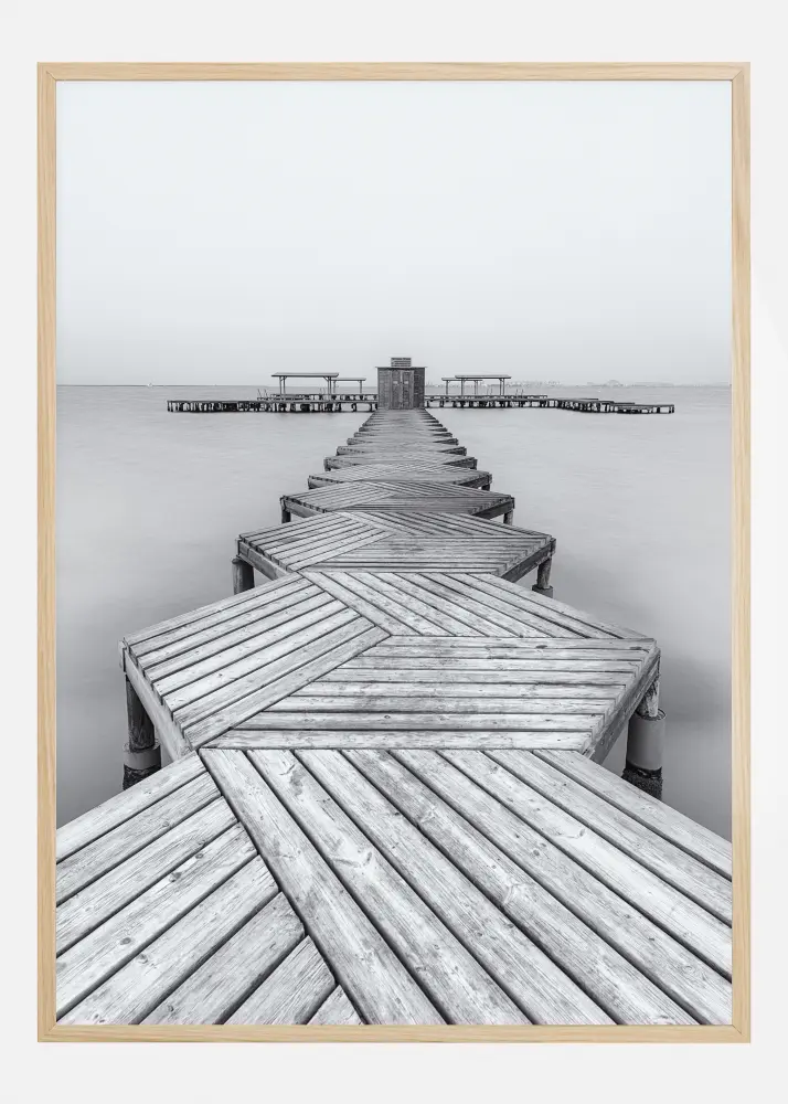 Un poster amuzant cu un pilon hexagonal care se îndreaptă spre depărtare peste un lac liniștit. Imaginea este în tonuri de gri atenuate, ceea ce o face să pară mai degrabă rece decât caldă. Pilonul de lemn te conduce în depărtare, unde te așteaptă un ponton. Combină cu o culoare deschisă pentru a adăuga căldură.