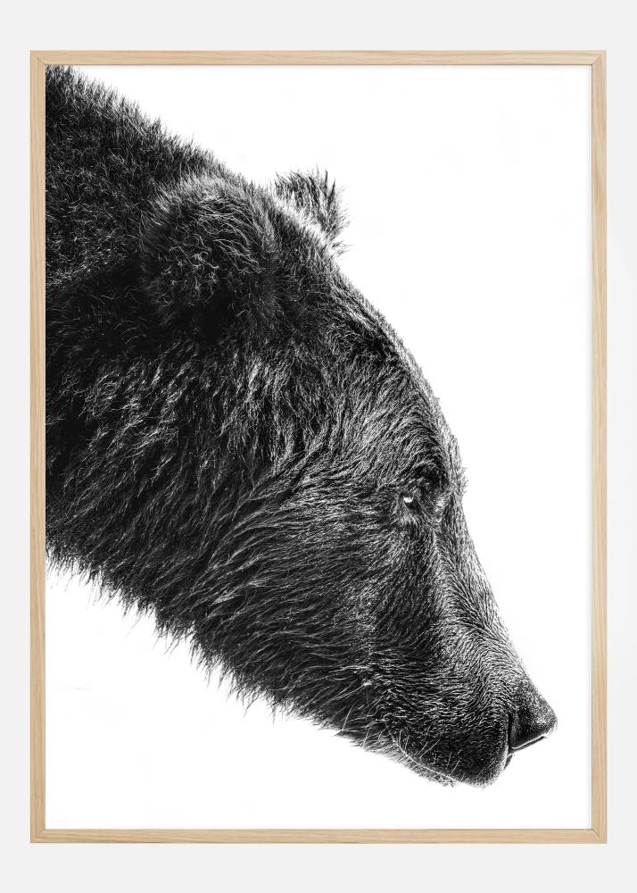 Această imprimare elegantă și puternică prezintă un prim-plan al unui urs în alb și negru, un motiv care oferă o senzație brută și onestă a spiritului indomabil al naturii. Imaginea este concentrată pe profilul ursului, unde fiecare detaliu al blănii și ochii liniștiți sunt evidențiați datorită contrastului dintre tonurile închise și deschise.