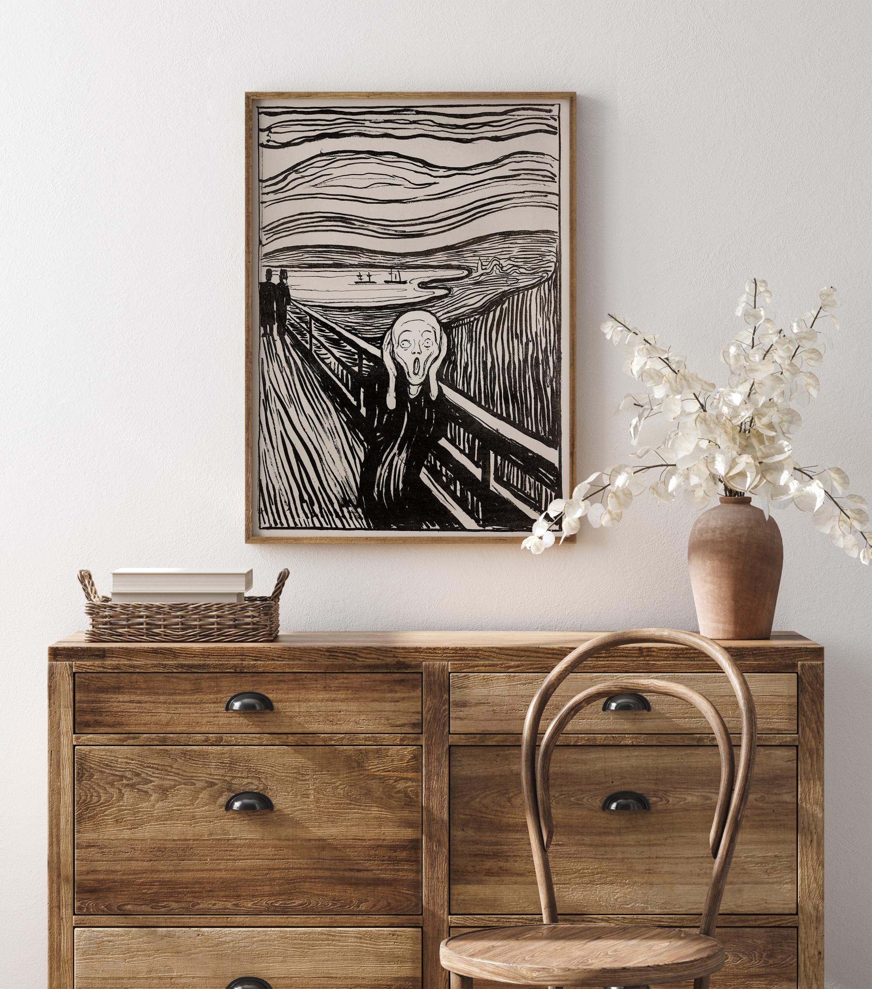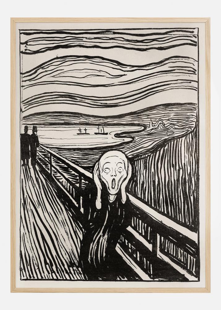 Un poster expresionist abstract al lucrării Strigătul a lui Edvard Munch în alb-negru. Acesta este un print iconic alb-negru pe care toată lumea îl recunoaște imediat, concentrându-se pe fața albă și țipătoare a persoanei de pe pod. Etalează-ți cunoștințele de artă cu această imagine clasică pe un perete colorat acasă.