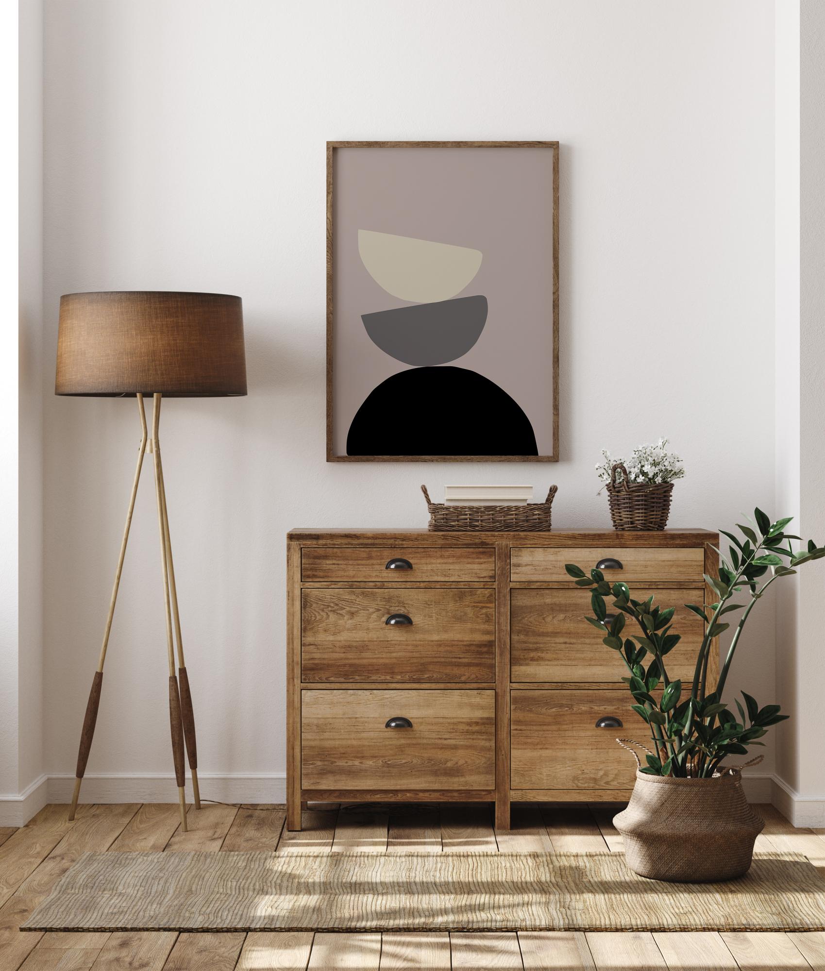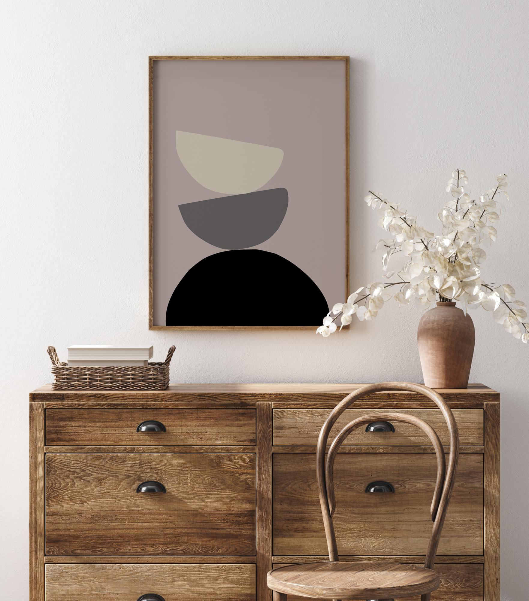 Un poster abstract cu trei semicercuri suprapuse pe un fundal gri. Un semicerc mare negru se află dedesubt, un semicerc gri mediu stă în echilibru deasupra, în timp ce la rândul său echilibrează un semicerc alb mai sus. Creează o atmosferă rece pe un perete albastru sau o atmosferă mai caldă pe un perete bej sau crem.