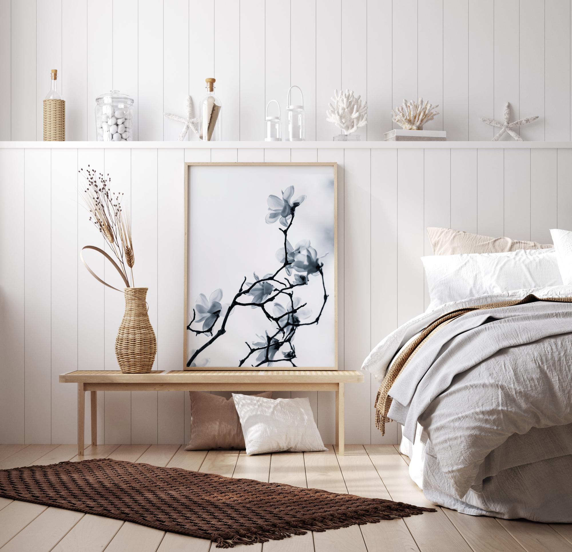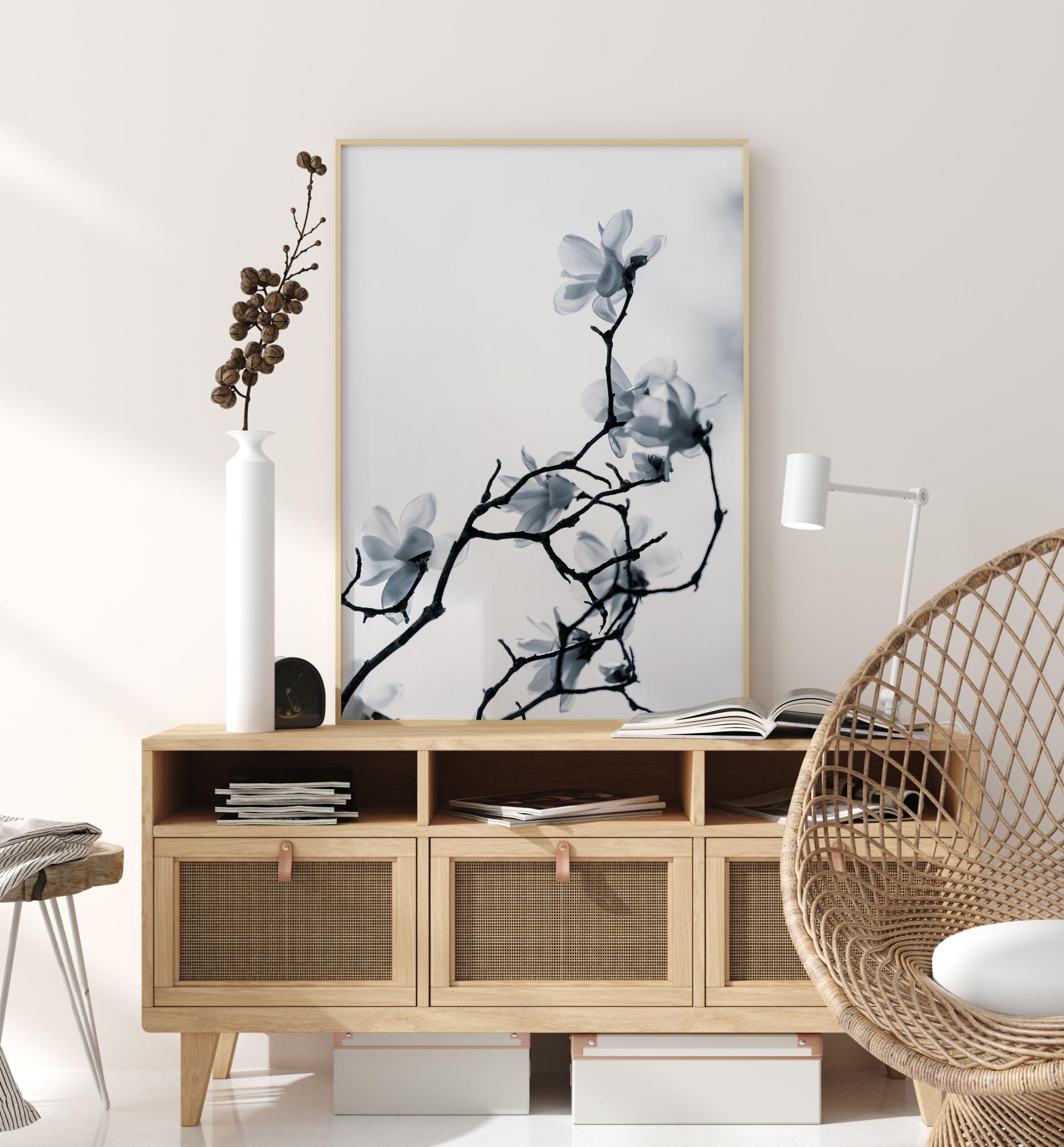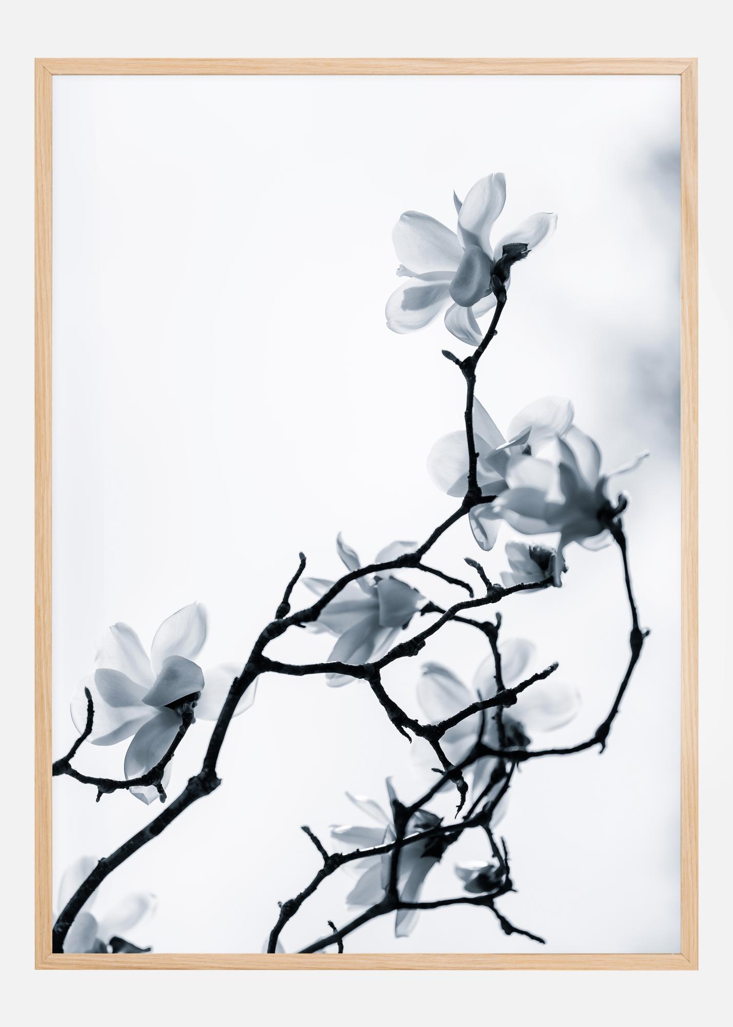Un poster cu flori cu o ramură grațioasă plină de flori delicate. Ramurile subțiri sunt negre pe fundalul cerului alb și se întind în sus, fiecare purtând o floare albă delicată. Liniște și calm radiază din această imagine, care s-ar potrivi bine ca un adaos la o baie sau pe un perete simplu din hol.