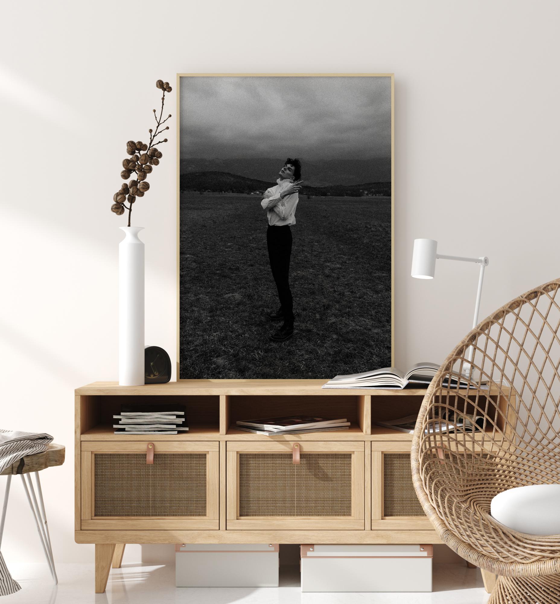 Un poster portret al unui bărbat fără griji, aflat în mijlocul unui câmp deschis. Tonurile subtile de negru și alb oferă o senzație naturală. Bucurați-vă de acest moment privat capturat pentru totdeauna atunci când îl agățați acasă.