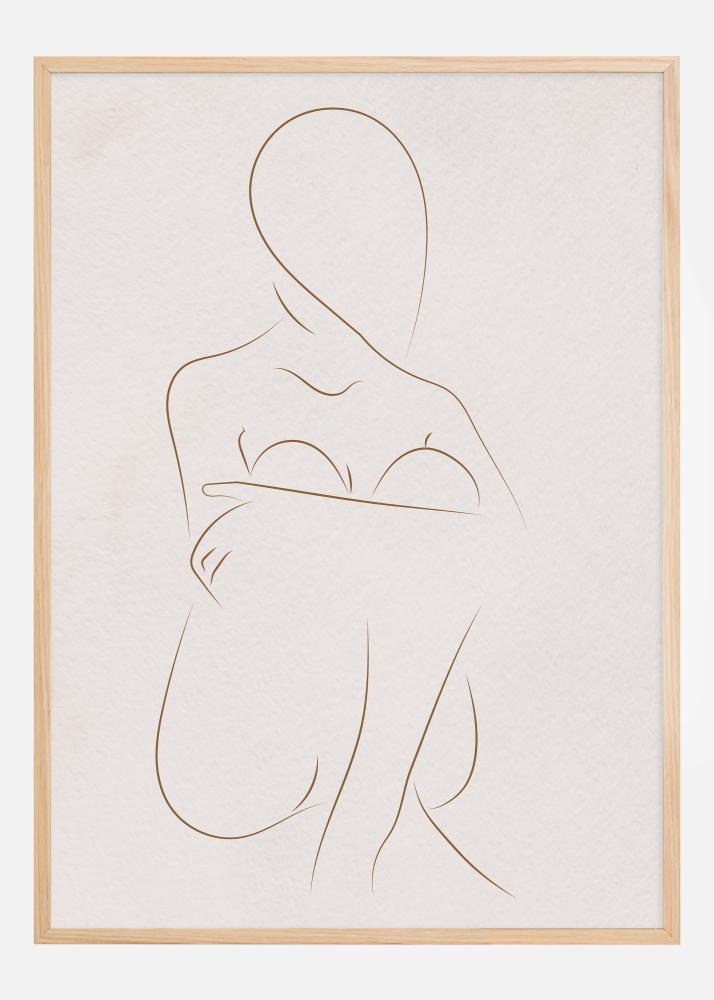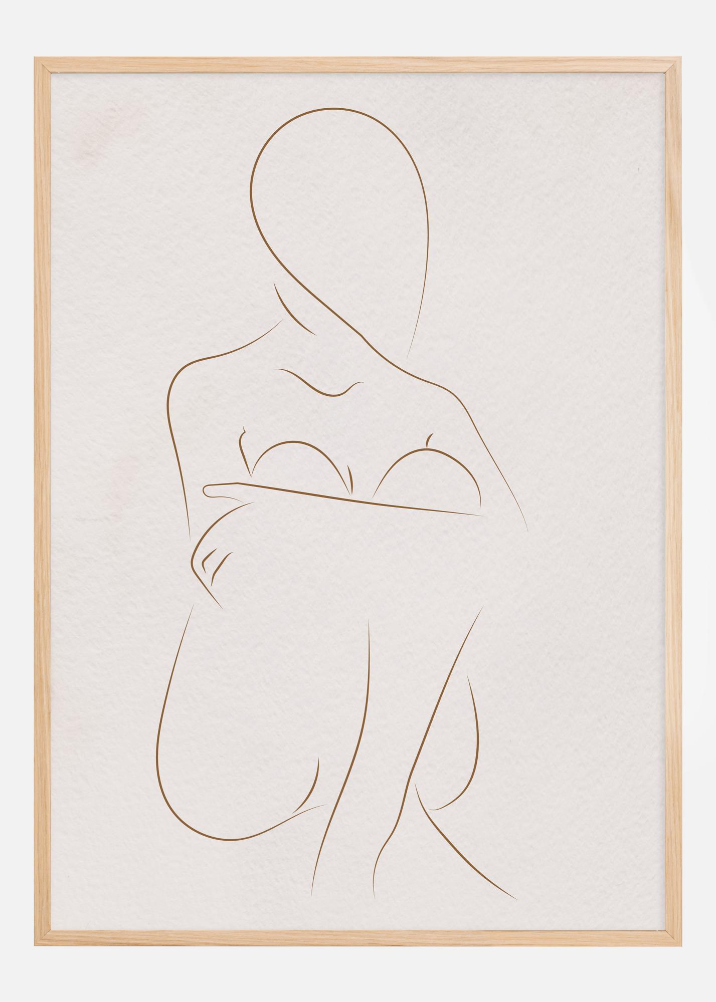 Această posteră elegantă și minimalistă ilustrează o figură feminină creată cu linii subțiri care captivează prin simplitatea sa. Arta liniară folosește o estetică subtilă și simplificată pentru a reprezenta forma feminină, oferind spațiu interpretării și imaginației privitorului. Contururile moi și expresia reținută creează o impresie modernă și rafinată care se potrivește bine într-un design minimalist sau scandinav.