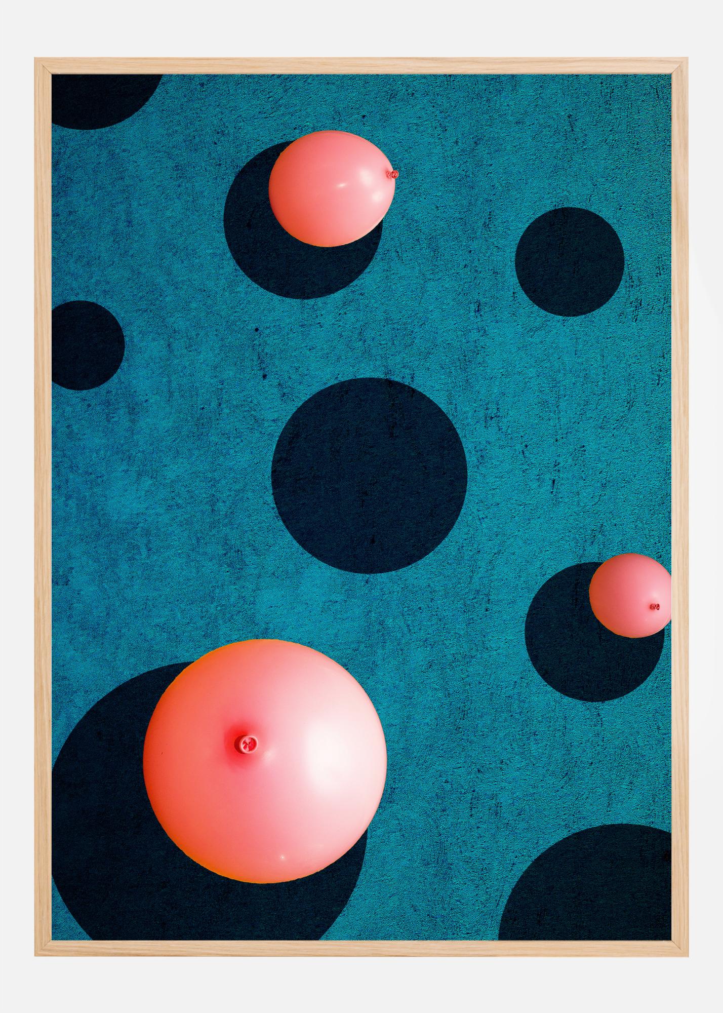 Un poster vibrant cu trei baloane portocalii pe un fundal albastru. Fiecare balon aruncă o umbră întunecată pe fundal. Dar există și mai multe cercuri de umbre albastru închis. Celelalte baloane trebuie să plutească undeva mai sus în acest poster ciudat, dar fascinant, cu puncte.