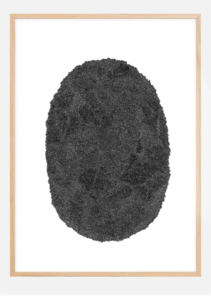 Un poster de artă grafică în cerneală neagră reprezentând o amprentă de deget, creat de Belinda Hellberg, Hells Bells Sthlm. Un poster elegant și minimalist, ușor de combinat cu alte favorite pe un perete mare de tablouri.
