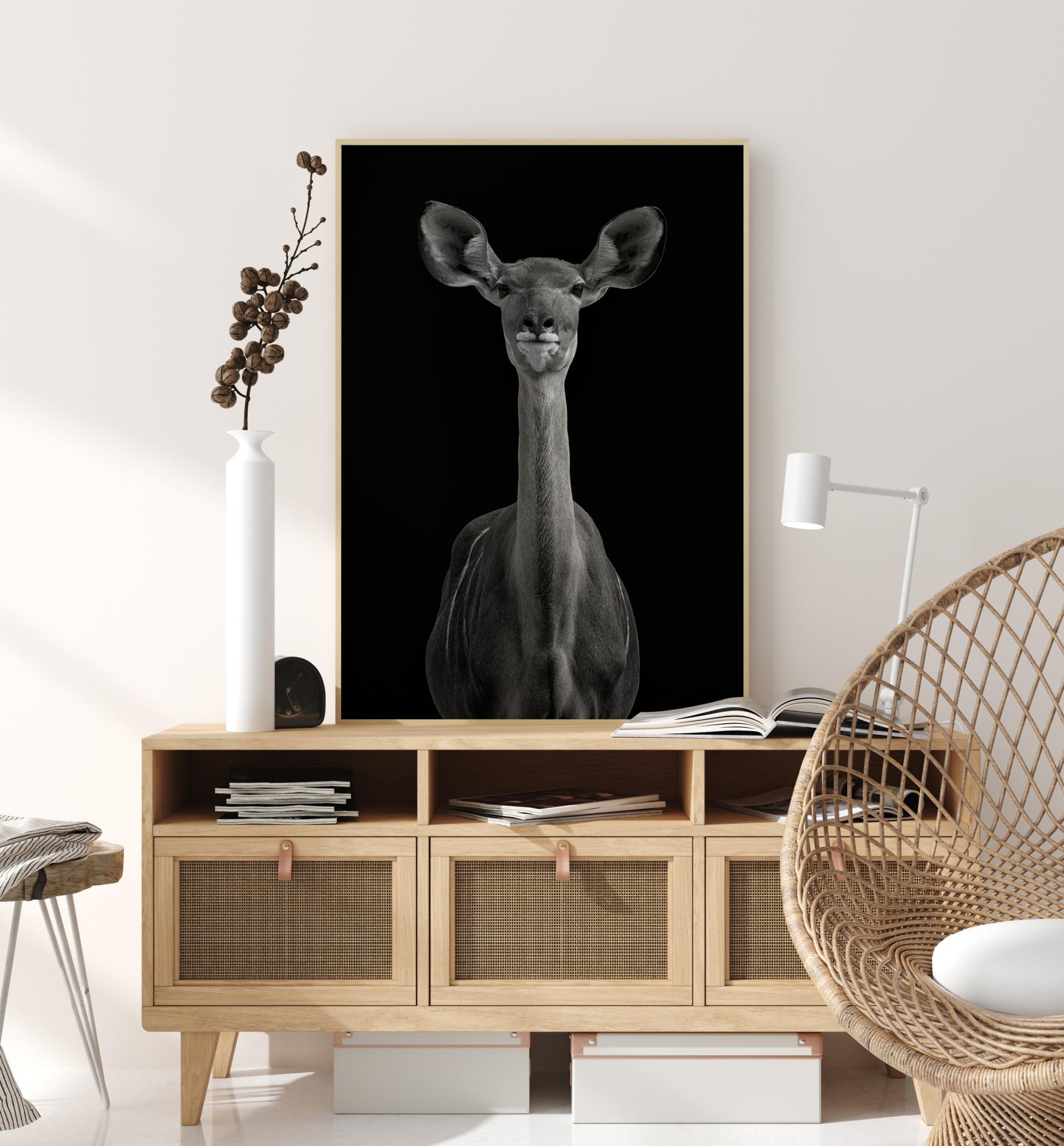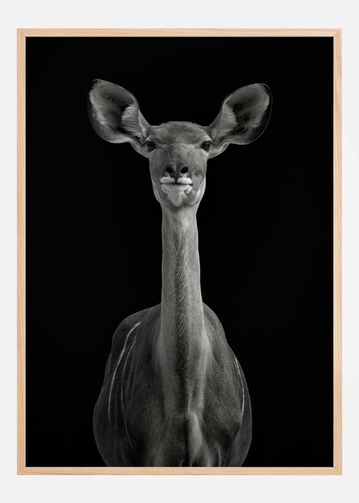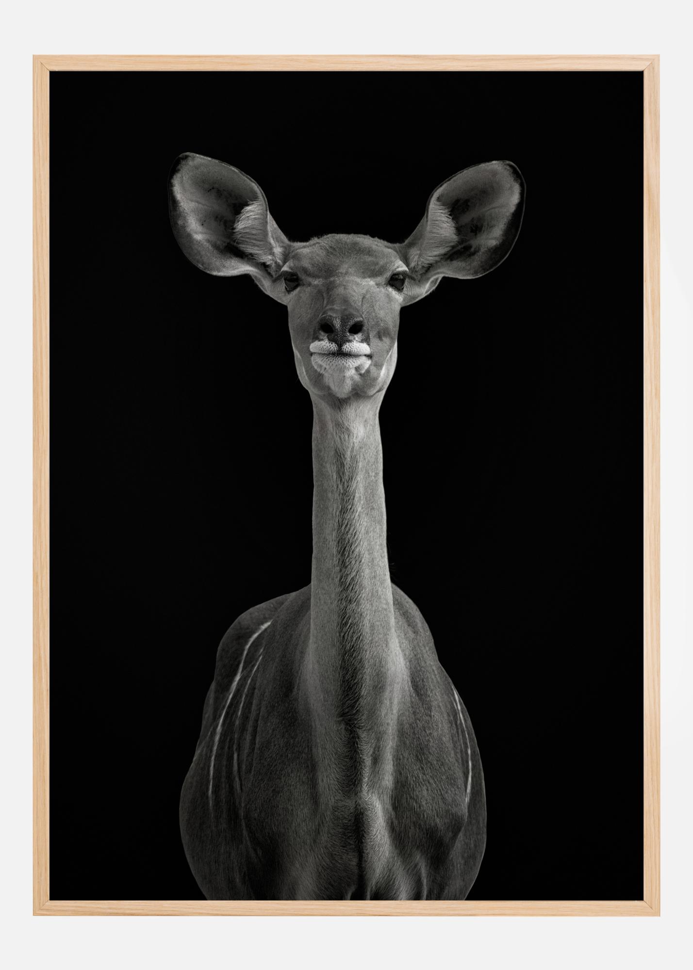 Un portret fantastic al unei antilope pe un fundal negru profund. Antilopa se întoarce spre cameră, cu urechile îndreptate înainte, în timp ce privește și ascultă. Gâtul ei este lung și subțire, iar ochii sunt blânzi. Combină cu o altă imprimare de animal pentru a crea o senzație zoologică uimitoare.