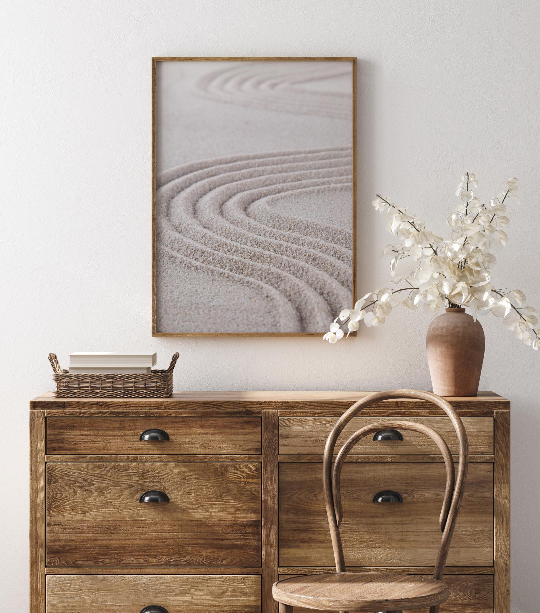Un poster cu prim-plan cu linii trasate în nisip. O greblă a fost folosită pentru a crea vârtejuri în nisip, liniile fiind la distanțe egale pentru a crea brazde adânci. Datorită prim-planului, se pot vedea grăunțele în modelul amuzant de vârtej. Combină cu un perete bej pentru a aduce culoarea nisipoasă în imagine.