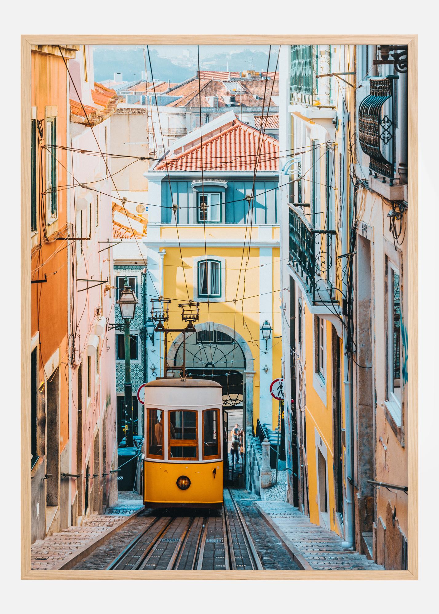 Această poster viu colorată și pitorească descrie atmosfera fermecătoare și vibrantă a unei străzi urbane europene, plină de istorie și magie cotidiană. În prim-plan vedem un tramvai clasic galben, un simbol iconic al transportului public al orașului, care se mișcă liniștit de-a lungul străzilor înguste flancate de arhitectura tradițională în tonuri calde de galben și roșu. Acest afiș este ca o deschidere către o altă lume și ne invită să urcăm la bord și să descoperim secretele orașului.