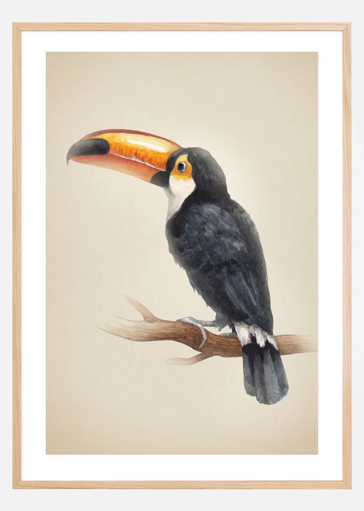 Un poster portret drăguț cu un tucan cu cioc mare. Această pictură a păsării are ciocul galben deschis care iese în evidență din fundalul gri. Cu spatele ușor întors, această pasăre strălucește cu penele sale negre lucioase în această imagine simplă. Asociați cu un alt poster cu păsări tropicale pentru a crea un set perfect.