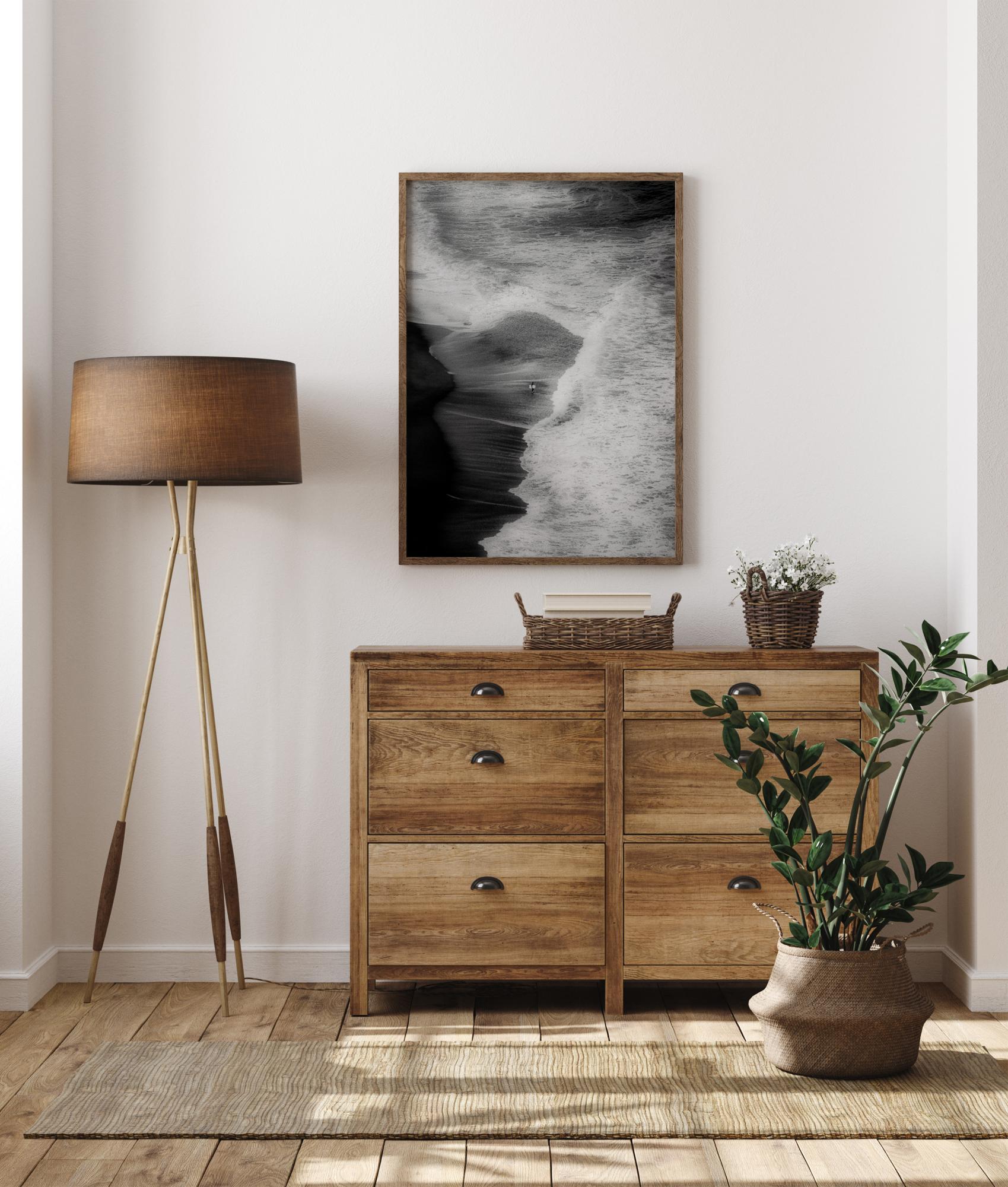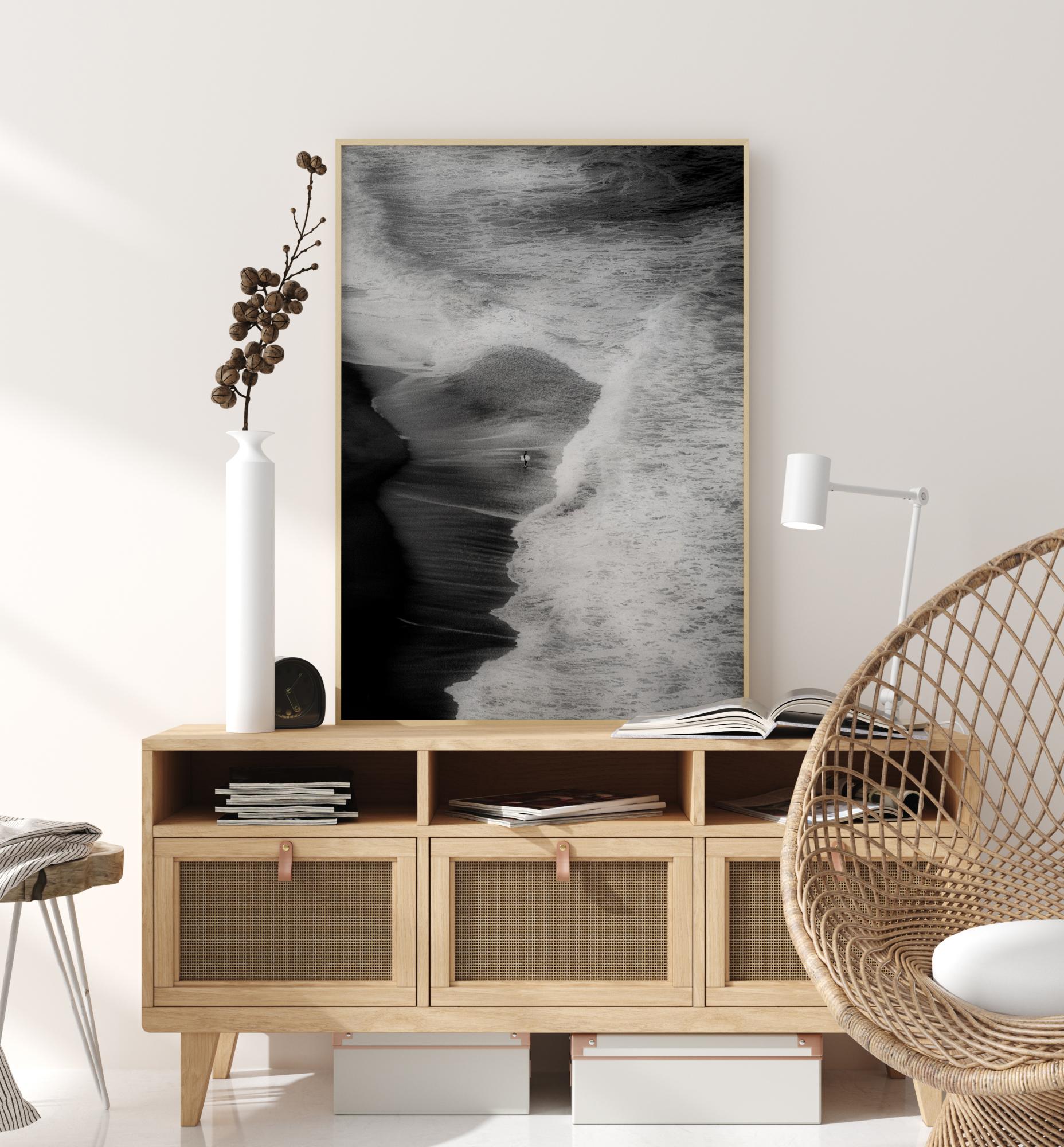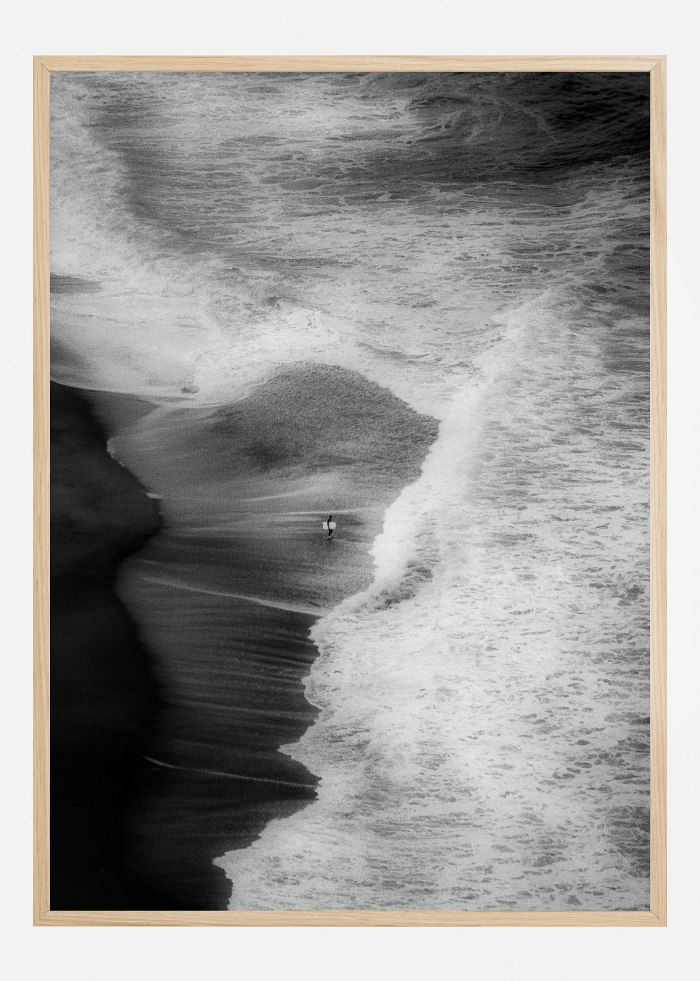Un poster cu o plajă și surfing din aer. Această imagine abstractă arată măreția naturii atunci când valurile ajung la țărm - surferul singuratic constituie un punct focal în imagine.