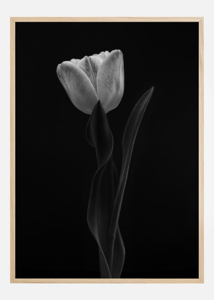 Un poster simplu cu natură, cu un singur lalea albă pe un fundal negru. Oferă casei tale o notă de eleganță când agăți acest print pe un perete într-o culoare simplă pentru a evidenția floarea.