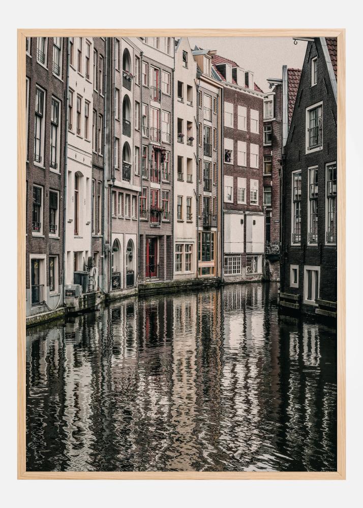 Un poster cu imagine urbană cu un canal care trece prin rândurile de clădiri înalte de oraș. Această imprimare sepia are doar câteva nuanțe de roșu și culori maro moi pentru a crea puncte focale. Casele se află la marginea apei și își aruncă umbrele pe suprafața spumegândă. Găsește culori bej potrivite pentru perete pentru a face culorile caselor mai clare.