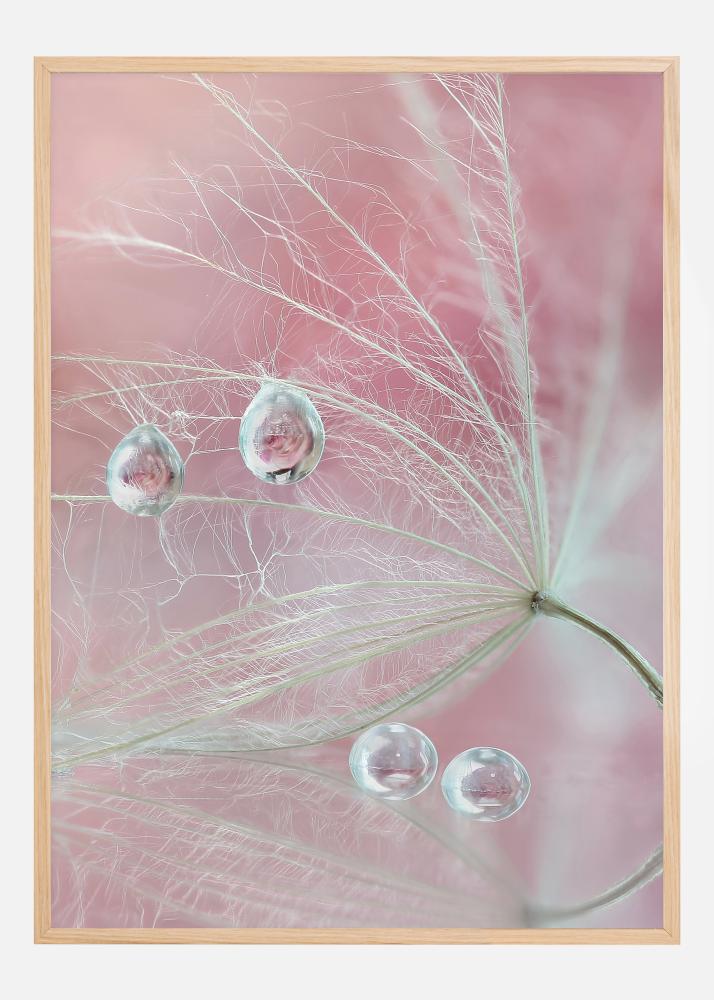Un poster elegant cu un cap de floare în formă de păianjen, cu două picături de apă pe capetele delicate în formă de pană. Un fundal roz deschis strălucește prin fiecare dintre picăturile de apă perfecte, în timp ce atârnă exact înainte de a cădea de pe floare. Bucurați-vă de echilibrul delicat al naturii.