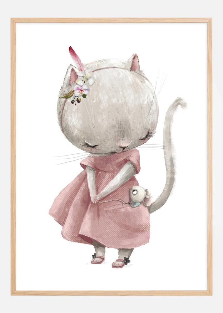 Această poster adorabil arată o scenă drăgălașă de prietenie neobișnuită; un șoricel mic care se odihnește în siguranță în brațele pisicii, amândoi îmbrăcați în haine de sărbătoare. Pisica este frumos îmbrăcată într-o rochie roz, completată de o decorațiune elegantă florală pe cap. Pictura fină în acuarelă oferă animalelor o delicatețe și căldură care emană prietenie și încredere.
