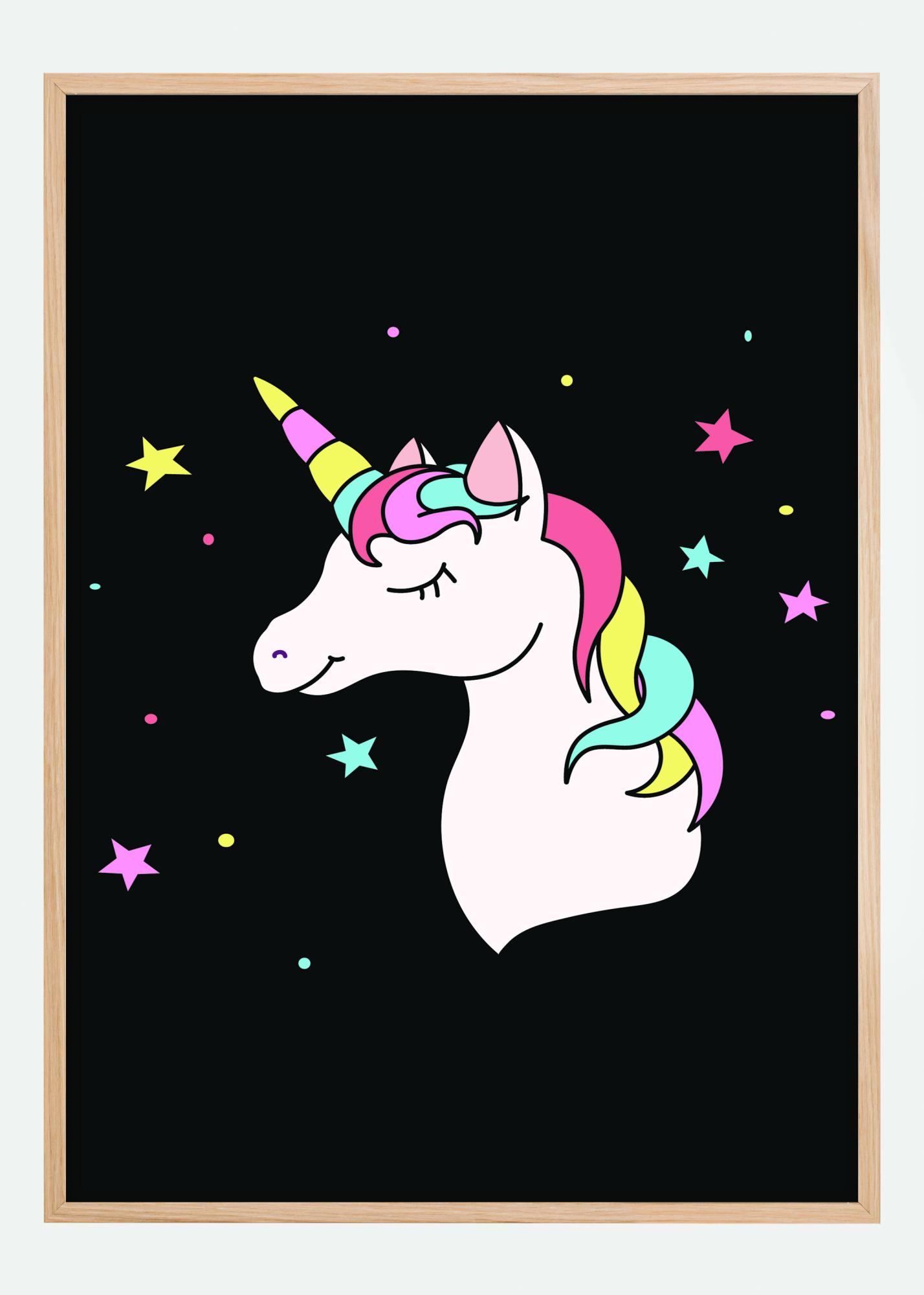 Un poster drăguț cu un unicorn alb copilăros pe un fundal negru. Unicornul are o coamă și un corn roz, galben și turcoaz. Stele în aceleași culori umplu fundalul negru din spate pentru a crea o atmosferă amuzantă, demnă de o prințesă. Agață-l în camera copiilor pentru a obține o imagine amuzantă, ciudată, care încurajează imaginația copiilor.