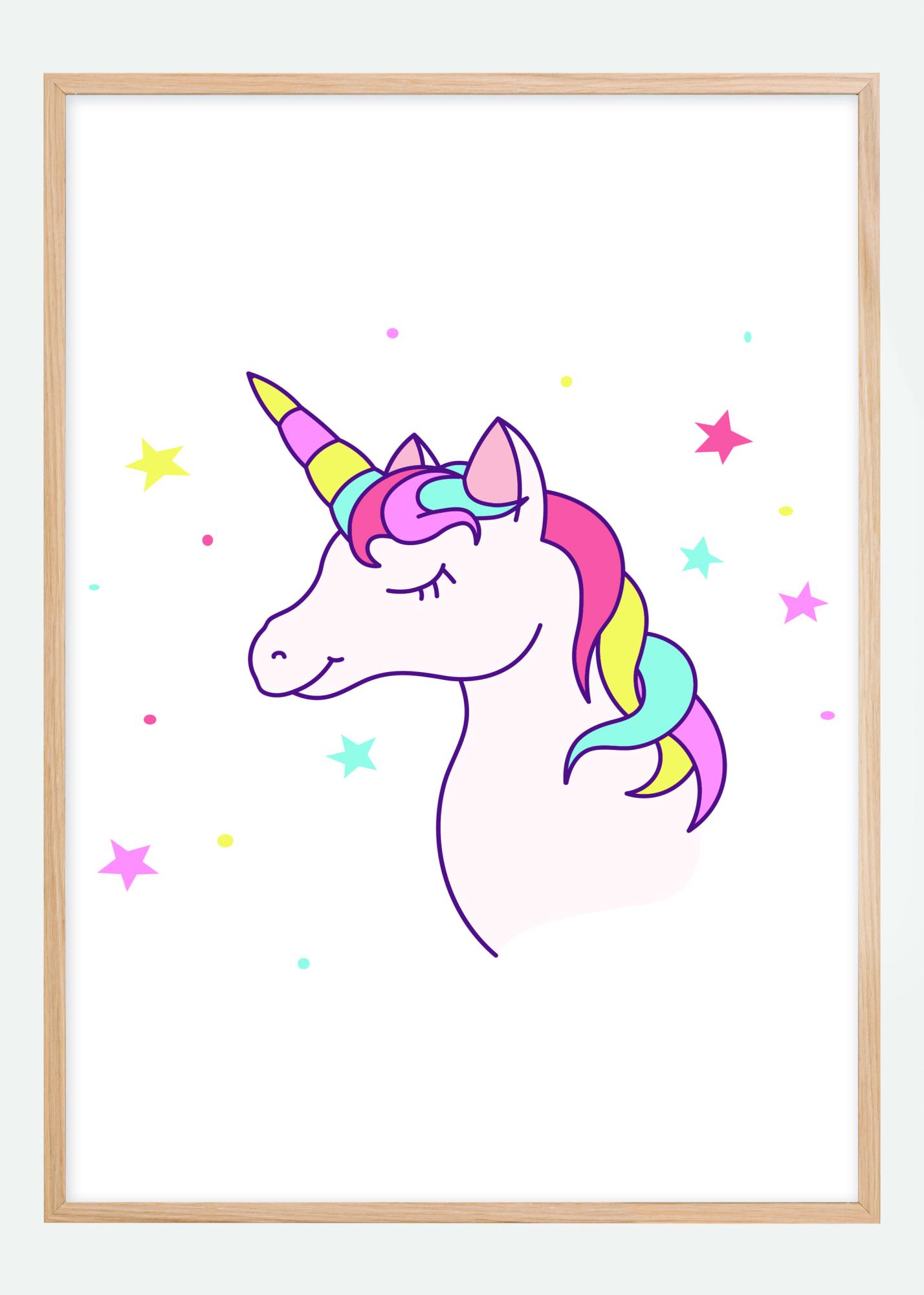 Un poster ingenios cu un inorog cu ochii închiși pe un fundal alb. Inorogul are o coamă și un corn galben, albastru și roz. Există, de asemenea, stele în aceleași culori care sunt împrăștiate în spate și creează o imagine magică și drăguță. Este perfect într-o cameră de copii, deoarece este un desen simplu și distractiv.