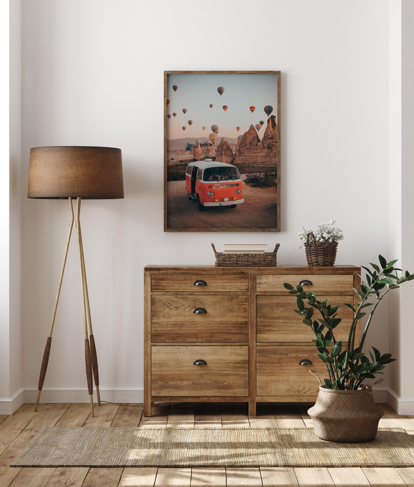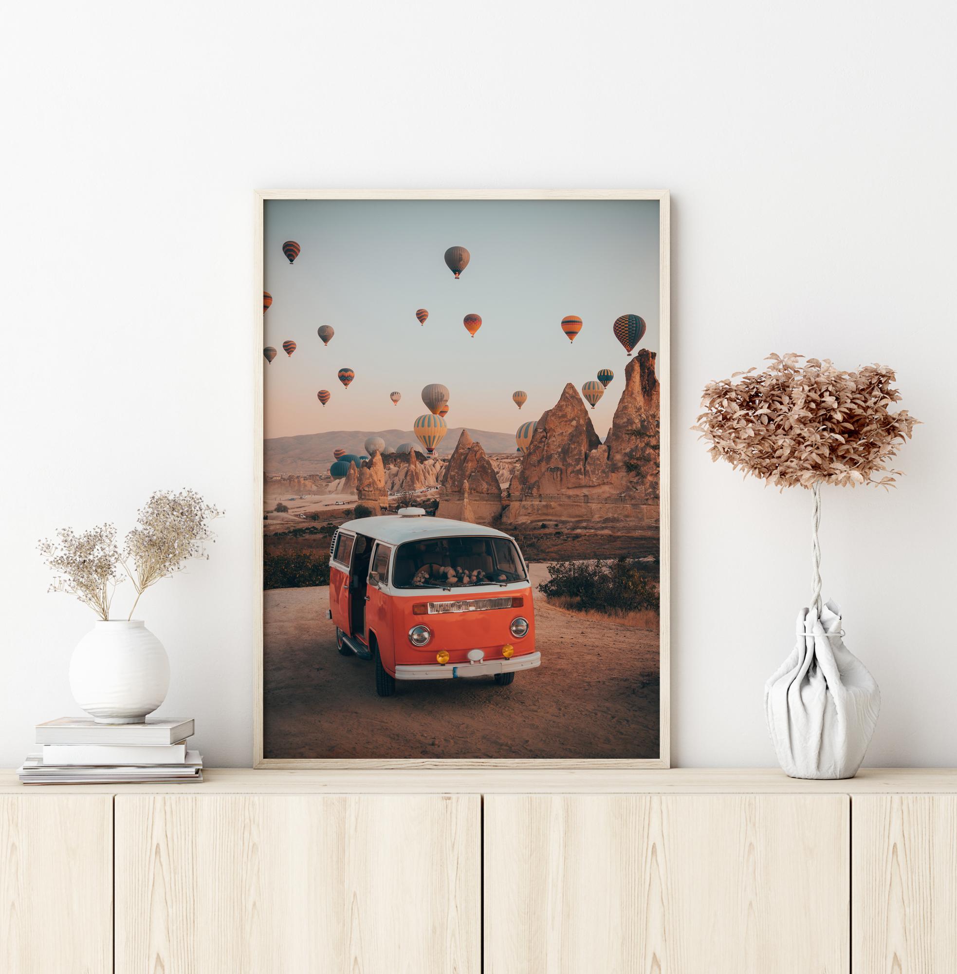 Un poster cu peisaj cu formațiuni de stânci interesante și baloane cu aer cald care zboară deasupra vârfului. Un autobuz Volkswagen portocaliu cu ușa deschisă se află în prim-plan. Baloanele colorate umplu cerul din spate în timp ce se ridică spre cerul albastru deschis pentru o călătorie magică.