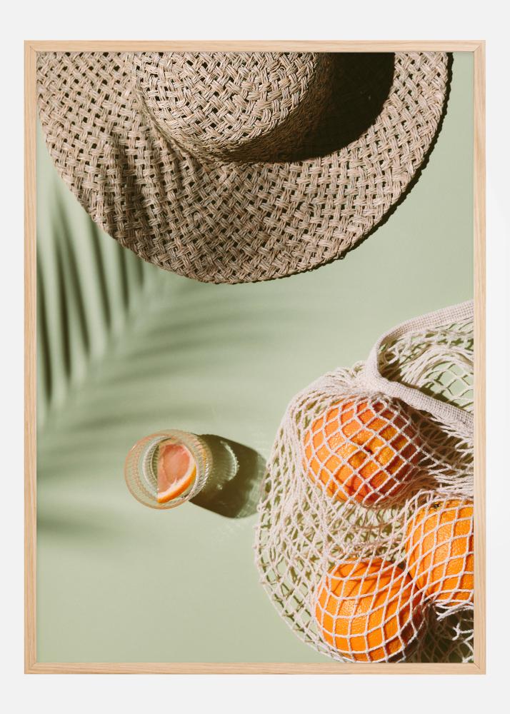 Această posteră plină de vară surprinde esența atmosferei de vacanță cu imaginea sa relaxată și proaspătă. O pălărie de soare împletită și o plasă plină cu portocale coapte de soare pe un fundal de tonuri verzi liniștitoare transmit instantaneu sentimentul de zile leneșe sub soare. Imaginea aduce imediat o asociere cu climate calde, fructe proaspete și un timp pentru relaxare. Este o alegere excelentă pentru oricine dorește să aducă puțin din acea senzație plăcută de vacanță în casă sau la locul de muncă.