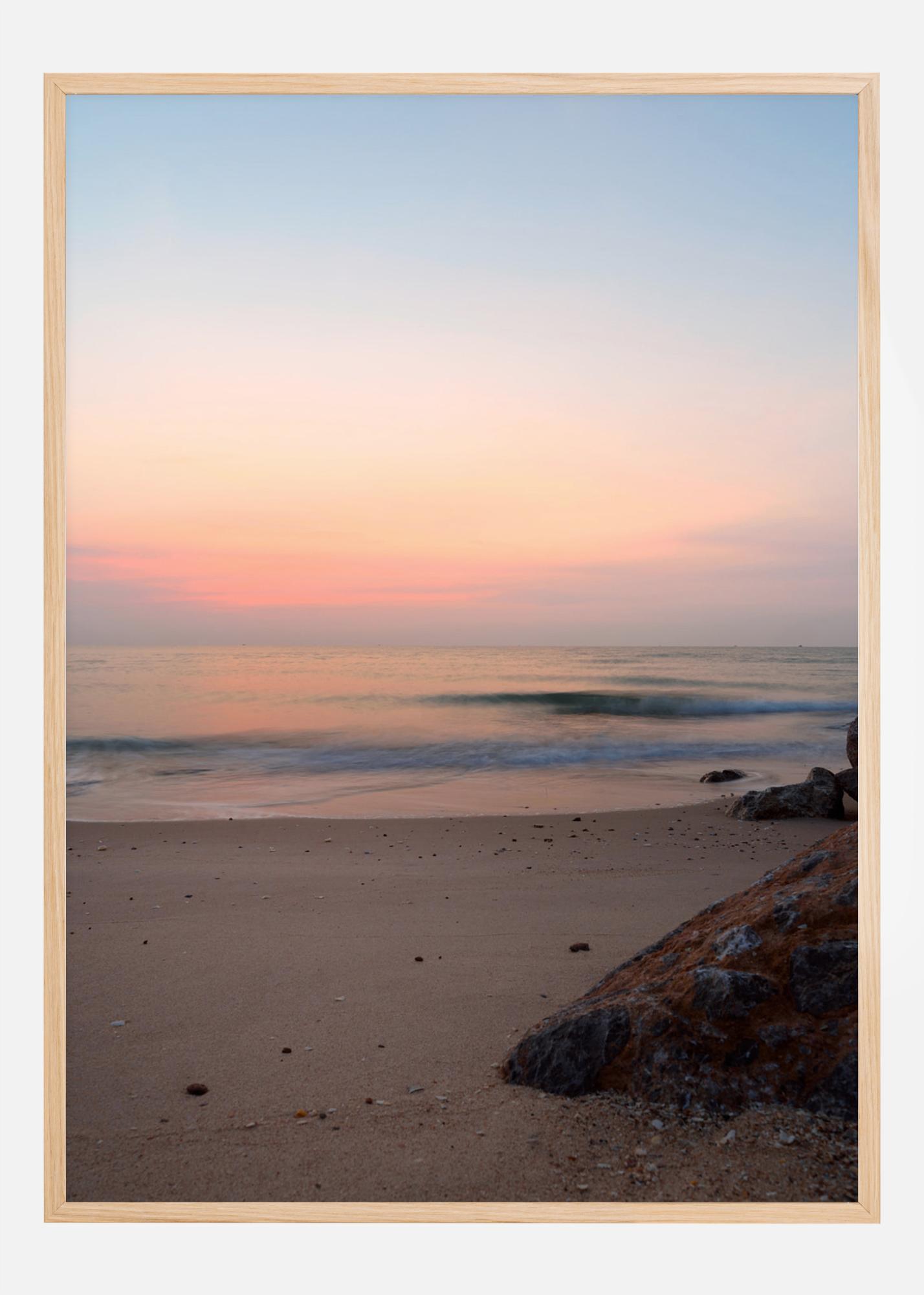 Un poster cu o plajă largă de nisip și marea liniștită în fundal. Un răsărit blând se ivește peste orizont și aruncă o lumină roz și albastră moale peste mare. Simte-te în vacanță cu această scenă de plajă calmă și liniștită.