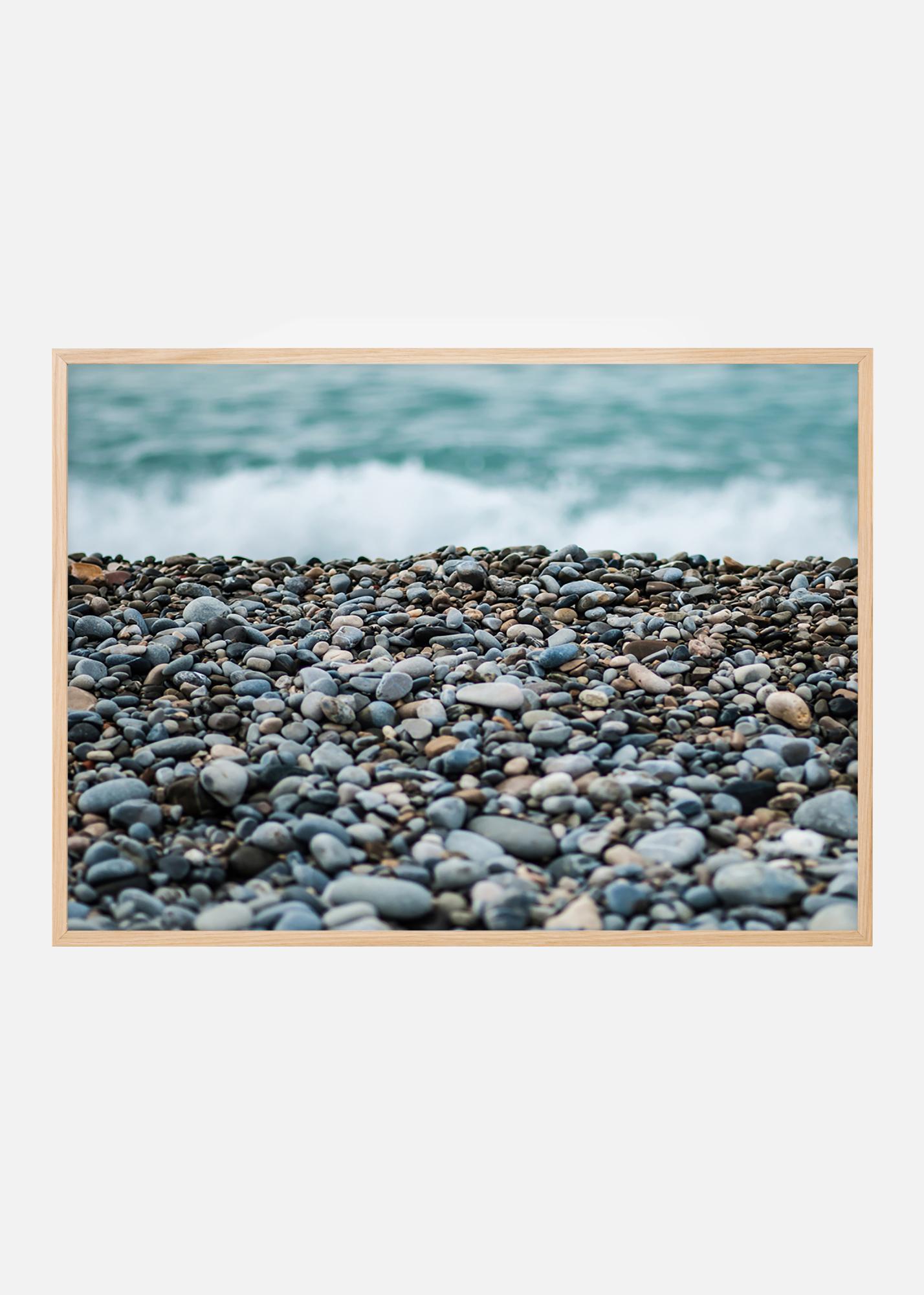 Auză murmurul valurilor mării din acest afiș cu o frumoasă plajă cu pietre în prim-plan. Profunzimea redusă de câmp oferă o imagine interesantă care atrage privirea în cadru. Găsești vreo bucată de sticlă rotunjită printre pietre? Schema de culori gri-albastru se potrivește bine cu o ramă îngustă pe un perete luminos, de preferat cu accesorii marine.