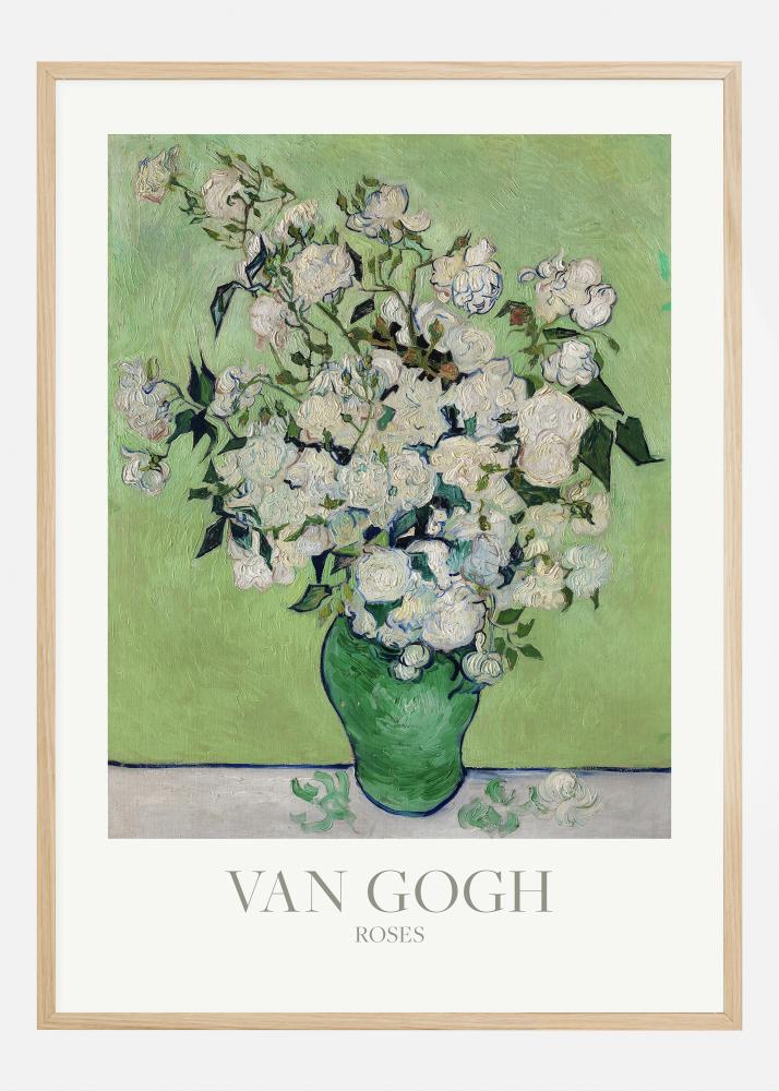Afișul luminos și vibrant prezintă "Roses" de Vincent van Gogh, o pictură care ilustrează un buchet de trandafiri încântători într-o vază verde intens. Stilul semnătură al lui van Gogh, cu tușe de pensulă groase și expresive și culori vii, evidențiază frumusețea delicată a florilor pe un fundal contrastant. Este o operă care radiază atât pasiune, cât și o apreciere profundă a frumuseții naturii.