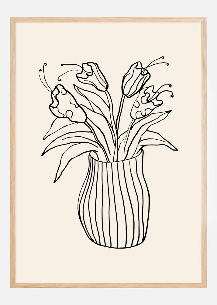 Un poster stilizat cu flori într-o vază. Liniile negre, puternice și îndrăznețe, conturează grosier florile din vază. Pe un fundal alb, florile ies în evidență clar. Aduceți un plus de culoare imaginii agățând-o pe un perete deschis și îndrăzneț.