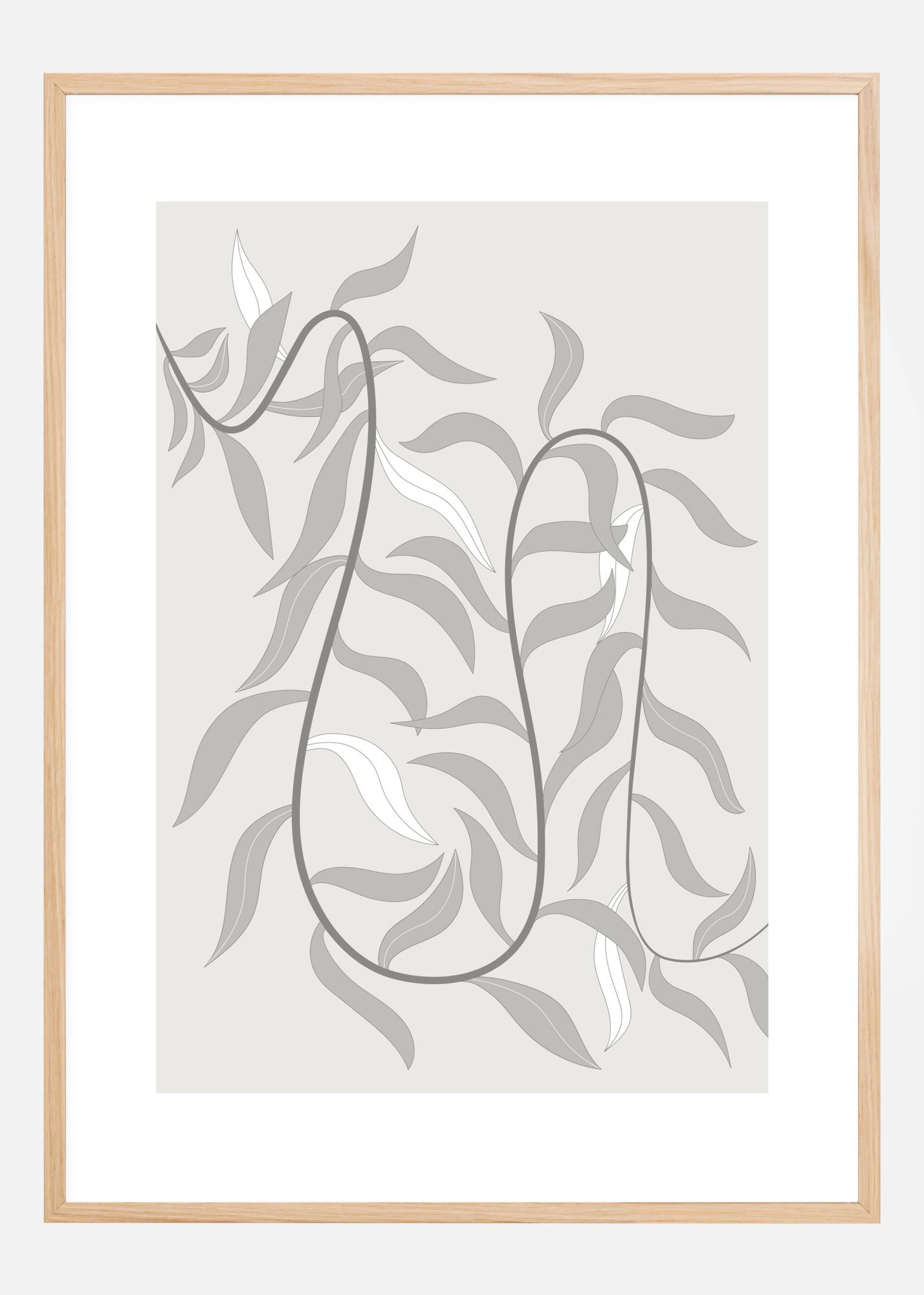 Un poster botanic abstract cu o viță de vie târâtoare care se încolăcește pe poster. Designul este într-un stil simplu de imprimare, cu frunze în gri deschis și alb. O viță de vie gri închis se încolăcește printre frunze și unește totul într-o formă serpuitoare. Combină cu un perete verde moale pentru a obține un efect de frunziș.