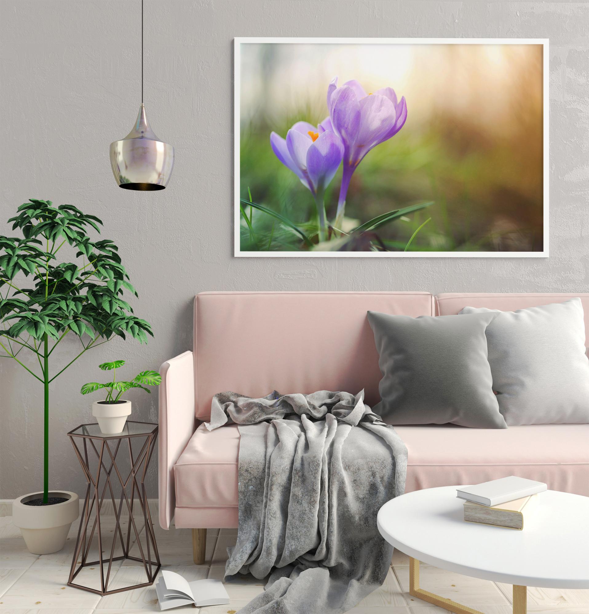 O imagine fermecătoare a poate celei mai colorate iubitoare de soare din primăvară, crocusul. Fundalul neclar în culoare complementară oferă un impuls florilor și o armonie fotografiei. Potrivită pentru cei care vor bucurie de culoare în casă și este întotdeauna frumos să folosești o nuanță din tablou ca o culoare de accent în restul decorului. Combinați cu alte motive vegetale pentru a crea o senzație de ansamblu în cameră.