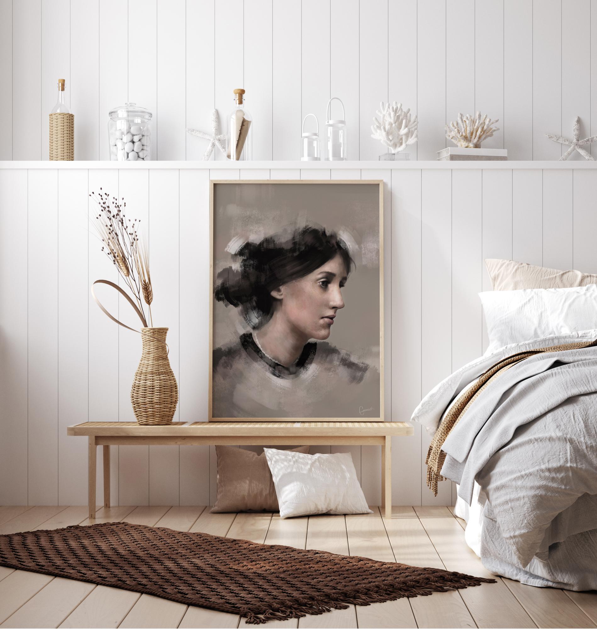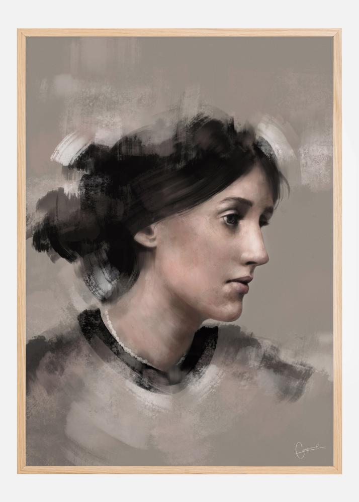 Un poster de portret cu Virginia Woolf în profil. Părul ei este reprezentat prin petice de culoare simple, moi, dar fața ei este redată cu detalii precise. Portretul este moale și feminin și conferă o notă aproape melancolică feței sale când privește în depărtare.