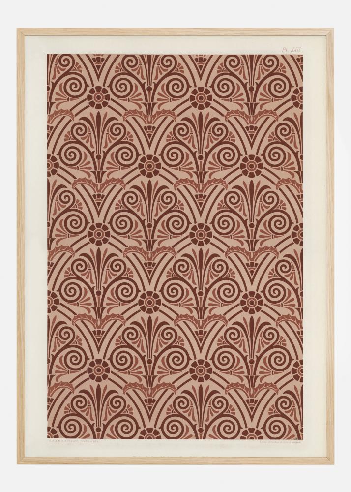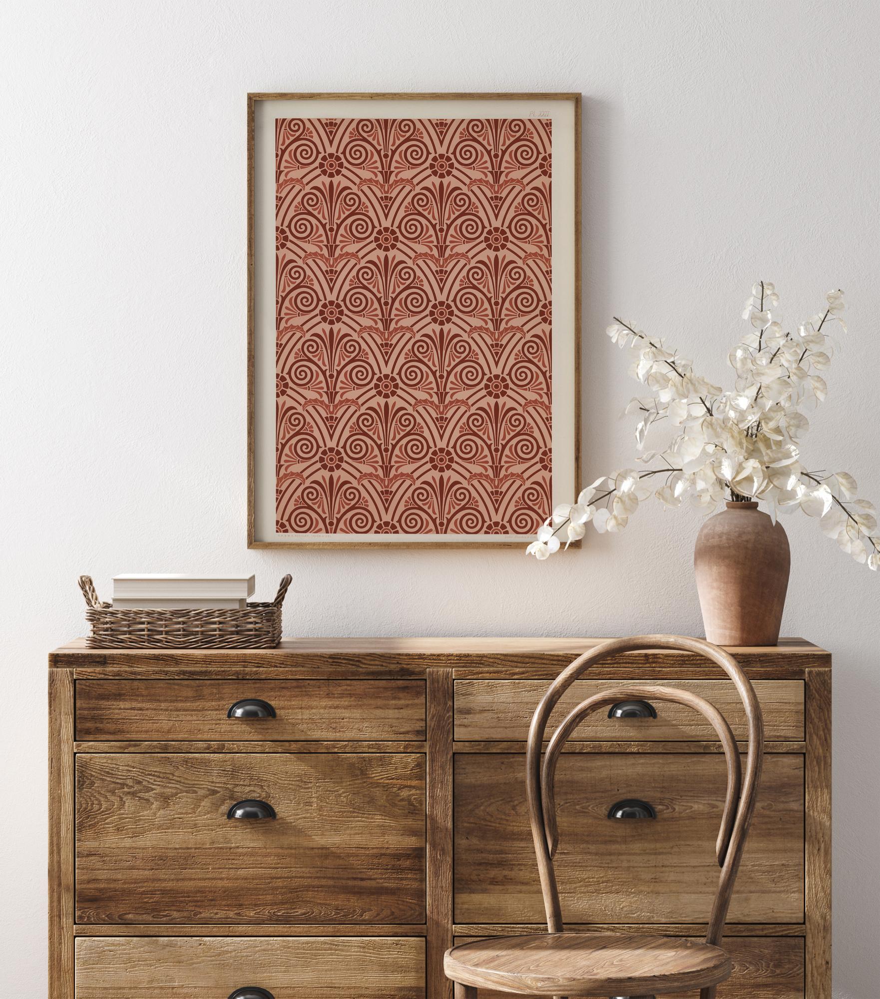 Un poster cu un model luminos și roșu repetitiv. În cadrul modelelor există cercuri ondulate care arată ca frunze sau franjuri. Există, de asemenea, forme de flori la intervale regulate, ceea ce face din acesta un model de imprimare botanic. Perfect pentru aplicarea pe perete, vezi ce imagini vezi în aceste modele complicate.