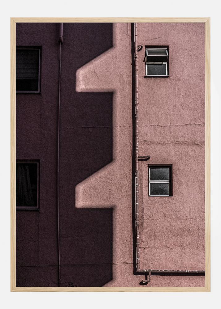 Un poster cu o clădire având exteriorul de culoare roz închis. Umbrele și lumina creează forme ciudate pe peretele clădirii. Ferestrele arată ca niște ochi, aliniate cu umbrele care seamănă cu nasuri, așa că această imagine pare să te privească înapoi.