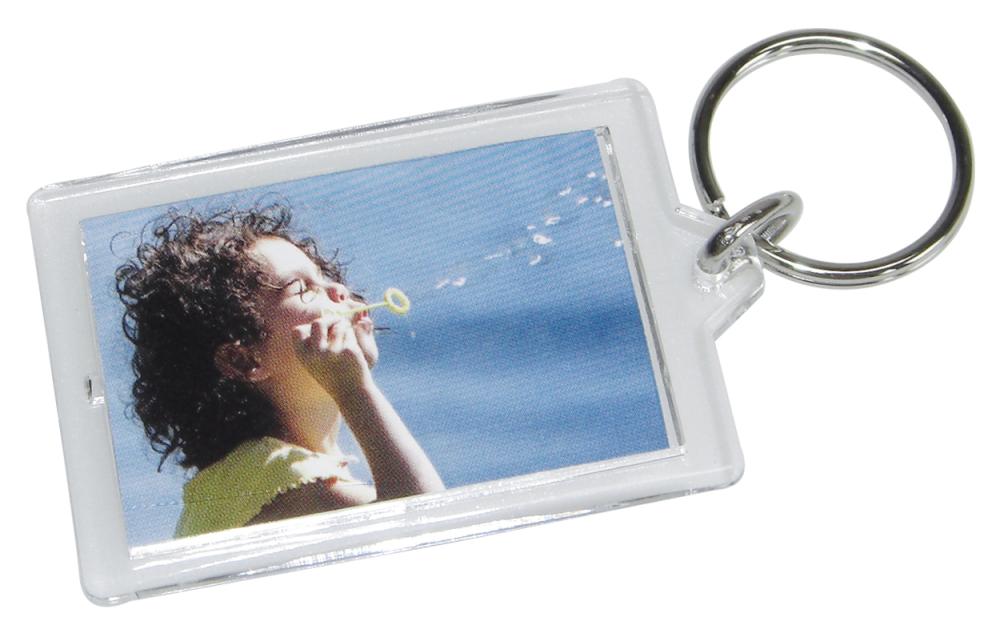 Păstrați-vă fotografiile preferate peste tot! Frumoasă breloc din acril cu spațiu pentru 2 fotografii (față și spate) de 3,5x4,5 cm.