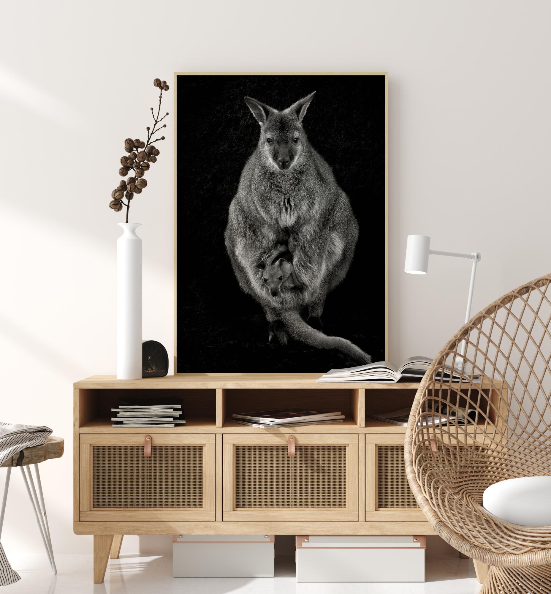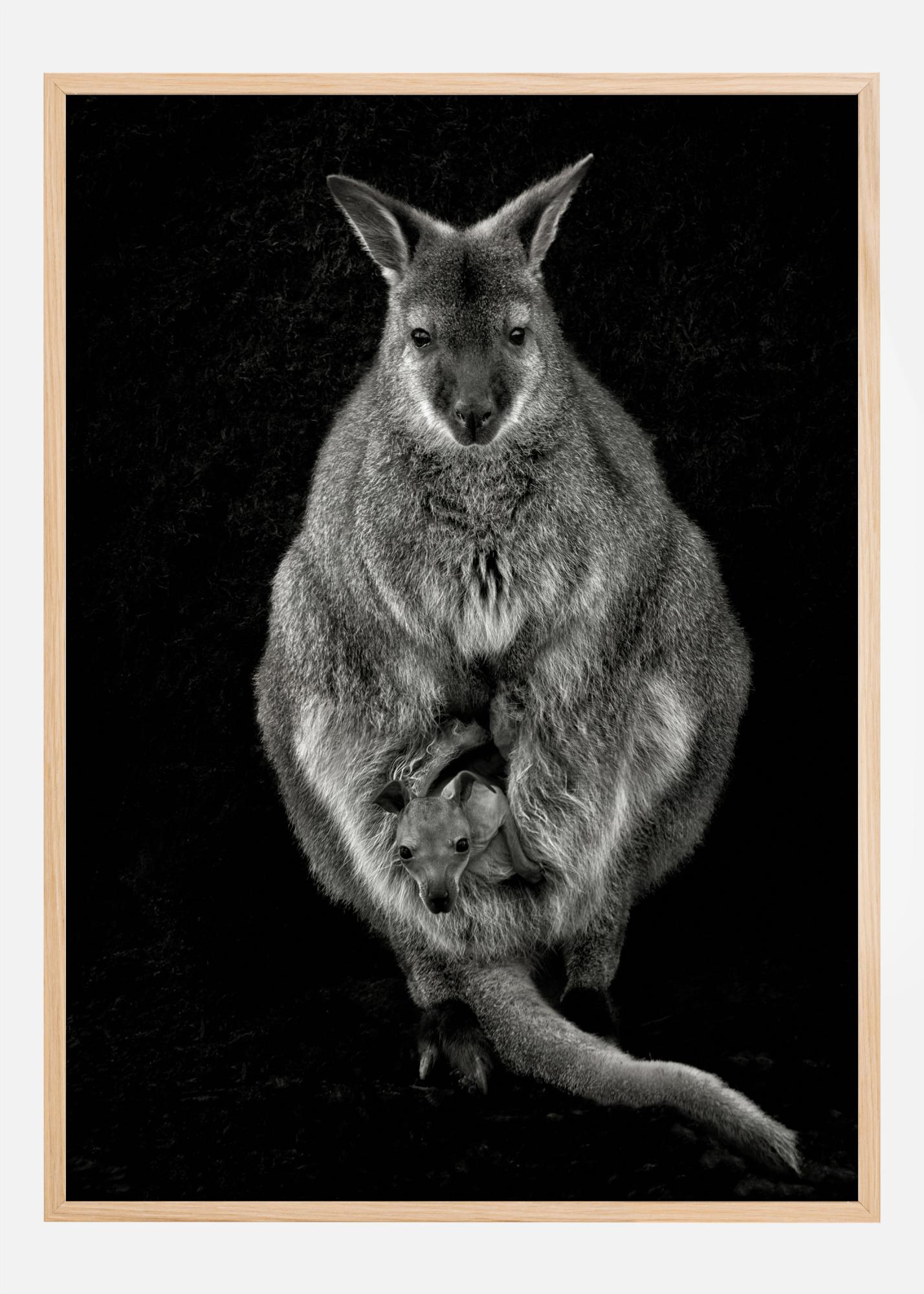 Un poster cu natură cu o wallaby și puiul ei. Perechea se distinge într-o imagine uimitoare pe un fundal negru. Obține acel sentiment dulce și blând când te uiți la această mamă și copilul ei.