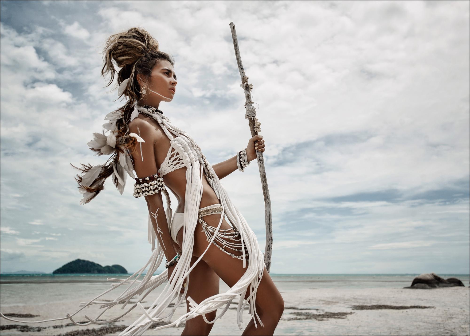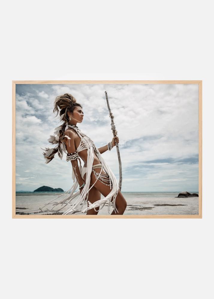 Un poster cu un războinic ce înfățișează o tânără femeie pozând pe o plajă îmbrăcată în haine tribale deschise la culoare. Pielea ei bronzată contrastează cu veșmintele albe și fluide și bijuteriile care îi acoperă corpul și care se împletesc prin părul ei. Poziția ei puternică este accentuată de lunga prăjină pe care o poartă în mâna stângă în timp ce privește spre dușmanii ei.